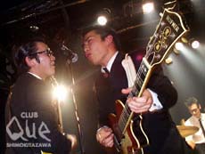 黒の細身のスーツにネクタイを締め、髪型はリーゼントでバッチリ。1曲終わる毎に一礼。まさにロックンロール・エチケットをきっちり守ったマージービート・バンド、THE NEAT BEATS。コーラス・ワークもうまく、4人のコンビネーションもGOOD。その上で人を惹き付けるコミカルな話術を展開するリーダー。ジェームス・ブラウンやバディ・ホリー等、機関銃のように繰り出されるロックンロール・チューンに、もはやノックアウト。クラシカルなマナーに新鮮さを覚えながら、あっという間の全10曲で、バトンタッチ。ついで出てきた4人組は、動きのフォーメーションもぴたっとキメて、冒頭からエンターティナーぶりを発揮する。その名もゴーグルエース。キッチュなグラサンにポージング、等々、カラフルなステージングに目が離せなくなる。サウンドは、エキゾな中にサーフ・ミュージックあり、、60'S風味ありと、少しレトロな雰囲気を漂わせながらも爆走。インストなどで見せるギターのテクニックなどもお見事。この演奏技術に裏打ちされてこそ、笑いのエッセンスが活きるのだと、ライヴを観ていてしみじみ実感。途中、MCでポール・マッカートニーの言葉、「いつでも、ただ何か人と違うことをしたかっただけなんだ」を引用し、「俺もそうなんだー」と面白おかしく説明しているところが、逆に彼らの純粋さを表わしているようだった。このゴーグルエースが主催するイヴェント第一弾を締め括るラストは。ご存じGYOGUN REND'S。彼らはステージに現われ、その音を鳴らすだけでいい。それだけで、彼らだとわかる存在感をすでに放っている。オープニングからすぐに場内を揺らし、熱くさせ、一気に駆け抜けていく。その疾走感がとても小気味良い。ひたすらにクールなスタンスを保ちながら、、あまりにもホットなステージング。アンコールまであっという間の出来事。のように思えた。いろんなサウンドに彩られ、冬の夜が更けていったのだった。"ゴーグルエースpresents「ピチガイ・ナイトショー」vol.1" ゴーグルエース/THE NEATBEATS/GYOGUN REND'S
