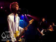 ソールドアウトの会場は、外と変わらぬ汗ばむほどの熱気。意表を突いたこの対決は、まさにQueならでは!と言いたくなる。まずは噂沸騰中の氣志團が先攻。美学に満ちた強烈なルックス、お客さんも真似して踊るダンス、曲をやっているより長いであろうMCは、誇張ではなく、抱腹絶倒。そのサービス精神には笑いながらも感心してしまう。もちろん、演奏の確かさとドラマチックな楽曲も彼らの武器。ライブというより、エンターテイメントショウを観ているよう気分だった。後攻のTHE JERRY LEE PHANTOMは、演奏が始まると、前列が狂喜乱舞の総モッシュ状態に。研ぎ澄まされた鋭さと火傷しそうな熱を持ったギター・ボーカル。挑発的なベース、エモーショナルなドラム。狂気とクールのギリギリを行くキーボードの音は、時折胸を引っ掻く。ステージとフロアが互いに呼応しながら激しく弾ける彼らのライブは、ライブバンドとしての絶対的な自信と絶大なる気迫を感じさせた。