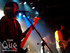 g&vo、b、dsの3人編成のはやぶさジョーンズが最初に登場。「君を切り取ってポケットに入れよう~」というフレーズが印象的な曲の途中、会場にいた男性がステージに上がり、ギターを弾き始めたのには驚いた。ちょっとした演出を挟み込んで注目を集めつつ、「はやぶさジョーンズという素敵なロック・バンドです」と改めてg&voのサノが自己紹介。ほんわかとした雰囲気を醸し出す彼も、激しい展開の歌には、表情も変貌していく。インストだけのプログレばりの曲ではエンジン全開。短いライヴの間にも彼らのいろいろな側面を見ることができた。続いて、エルヴィス・コステロの「Pump It Up」のSEをバックに颯爽と現われたSepa。1曲目からもうノリノリ。「まだまだ夏は終わっちゃいないぜ!」とかけ声も威勢いい。跳ねる、飛ぶ、疾走感のあるステージは、熱気に満ちながらも爽快。バンド・コンビネーションもよく、ビートの効いた曲をたたみかけるように浴びせてくる。voの村上が、このところレコーディングと曲作りの日々だったとMCで語る。久々のライヴのせいか、気合いも十分。新曲や、アンコールの「BEAUTIFUL」では、思い切り発散させるかのごとく全力疾走。ほとばしる彼らのパワーを、この夜そこにいた観客誰もが受け止めたに違いない。"THE 7 WONDERS OF Que~CLUB Que 7th Anniversary~" Sepa vs はやぶさジョーンズ