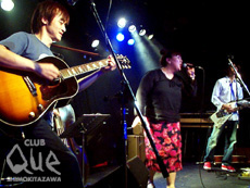 昔から繋がりがある両者は意外にも対バンとしては初だとか。まずは、かせきさいだぁ。1曲目が終わる頃には、ライブを観るまで彼に対して抱いていた「宅録日本語ラップ」という私の安直なイメージは一掃された。エレクトーン、DJ、ギター、そしてかせきさいだぁのボーカルは、互いにぶつかりあったり、ふざけあったりしながら、時には自由気ままに、時には相手の出方を探り合いながら、自分のアレンジを決めて曲が進んでいく。お客さんなど殆どムシして、ひたすら自分が楽しむためにやっているようだが、それが何とも言えないカッコ良さで、音的カテゴリーなんて無意味なロックなステージだった。Hicksvilleは、かせきさいだぁが歌詞を提供した曲から始まった。声とアコギ2本と、サポート鹿島氏のベースという音量としての迫力はそれほどないものの、それぞれの存在感は、手放しで賞賛したくなるほど、素敵だ。特に真城さんの声は、聴いているだけで癒さたような気分になってしまう。ラスト2曲目から木暮氏がエレキに持ち変え、笑いもこぼれるほど壊れ気味のギタープレイをやるも、機材トラブルのため不発に終わってしまったのが残念だったが、最後の曲では会場からの手拍子に合わせ、歌い演奏され彼女達らしい大らかで温かい雰囲気の中、本編は終了。アンコールには、かせきさいだぁも再び登場し、戸惑いながらも楽しいセッションをやってくれた。"THE 7 WONDERS OF Que~CLUB Que 7th Anniversary~" Hicksville vs かせきさいだぁ
