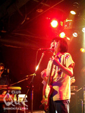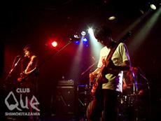 壮大なSEをバックに颯爽と登場したのはサード・クラス。話題が話題を呼んでいるこのバンド。プログレ的なオープニングで、のっけから彼らの独特な個性を見せつけられる。『新宿ミーティング』というオムニバスCDに収録されてい「かたくなに」、そして「心のでき」などを披露。「今日のサード・クラスの調子は上々です」とg &voの袴田が語り始め、いろいろと説明するのだがそのMCが面白い。そして袴田のみならず、バンドのメンバー全員が個性的。そのキャラの立ち具合といい、楽曲の色とりどりといったバラエティに溢れる感じといい、ひと言では言い表わせない雰囲気がある。シュールな歌詞に、サイケからメロディアスなもの、ポップ感満載の曲まで幅広く網羅、そして武藤新のヴァイオリンがより彼らのサウンドを際立たせる。途中、袴田のギターの弦が切れるというハプニングがあったが、その間、武藤が難なく持ち曲を奏で、観客からリクエストまで募って弾いてみせるという余裕も見せた。ただ者ではない感じがありありだ。その不思議さや奇妙な感じに最初は違和感を覚えても、ライヴを観ているときっとそのまま彼らの世界に引き込まれてしまうはず。なんとも変わった魅力を持ったバンドだと改めて思った。その後、「ラジオスターの悲劇」のSEをバックに現われたのは、人気抜群のジァイアントステップ。スリー・ピース・バンドながらも迫力あるサウンドをかましつつ、片やアイドル的要素も併せ持つ。一心にステージ上の彼らを見つめ拳を上げる女の子達。激しく音をかき鳴らす彼ら。その一体感は、きっと誰にも邪魔することのできないものだろう。新曲を織り交ぜながらビートを効かせた曲を次々と繰り出し、会場にも熱気が溢れていて、彼らの絶好調ぶりがわかるというもの。アンコールを求める拍手にもすぐに答え、「STAR RIDE」などを演奏。溌剌と、すがすがしいステージングで締め括ってくれた"THE 7 WONDERS OF Que~CLUB Que 7th Anniversary~" ジァイアントステップ vs サード・クラス