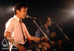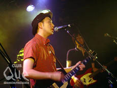 ここ数年、アルバム・リリースやツアーなどバンドでの活動も順調に成功し、メンバー各々ではさまざまなミュージシャンのサポートとしての活動も展開するなど、大活躍中のPLECTRUM。彼らが一時フラットな状態になってから、再びギアを入れ直して企画した、ゴキゲンなメンツを集結させたイヴェントがこの日、実現した。初夏の日曜日だけあって、ライヴ前のワクワク感と休日のゆるさを抱えたのんびりムードが漂うなかライヴ・スタート。トップ・バッターはGOMES THE HITMANのヴォ-カル・山田が登場し、ギター一本でしっとり聴かせる弾き語りナンバーを次々と披露していく。ポップながらもどこかセンチメンタリズムを感じさせる叙情性あふれるメロディと彼のまっすぐな歌声が、会場をあたたかな空気で包み込んでいた。場内がほんのり熱気を帯びてきた頃、続々と観客も増えてMarauderがステージに。「俺たち、切な系」とMCで何度も言っていたように、切なさも醸し出すようなキャッチーなサウンドが胸にぐっと響く心地よさ。フロントマン3人が曲ごとにヴォーカルを交代して歌う、珍しいスタイルが印象的だ。さらにオーディエンスの体温も上昇するなか、バック・バンドを連れて大所帯で現れたROUND TABLE。のっけから、サックスが渋く流れるスロウ・ナンバーを演奏し、会場の雰囲気をムーディーに染め上げていく。ジャジーな曲からボサノバ調の曲、そして疾走感あふれるアッパーな楽曲までを幅広く演奏し、その実力を見せつける。北川と伊藤を取り巻く管楽器やリズム隊のバランスがよく、彼らの放つグルーヴ感がたまらなく気持ちのよい空間を作り出していた。最後を飾ったのは勿論、企画主のPLECTRUM。「素晴らしい今日のイヴェント、ありがとうございました」とヴォ-カルの高田が感謝の言葉を伝え、1曲目からギターポップ・チューンを炸裂させて会場を揺るがす。力いっぱい演奏する彼らの姿に圧倒されながらも、立て続けに披露される痛快なロックンロールに身をまかせて会場は大揺れに。曲の展開もよく、優れたポップ・センスを持つバンドだと感じた。そういえば、この日最初に登場した山田がMCで「井の頭公園でボートに乗りたいから近くの友達を呼んだんだ。その友達は汗びっしょりで急いでやって来てさ…」と話していたのだが、最後に登場したPLECTRUMの高田が「あのボートの話、呼び出されたのって実は、俺なんだ~」と話し、会場がドッと笑いの渦と化していた。観客の心を掴むのがうまいバンドだと思った。この日の全体の流れとして、ラストにかけてテンポよく盛り上がっていったスムーズな流れが出来ていて、ほとんどの観客は御満悦の様子。思わず、「BOYS OF THE SUMMER」の次の開催にも期待したくなった。"RETURN TO NATURAL 2002 夏の陣" "BOYS OFF THE SUMMER" PLECTRUM/Marauder/ROUND TABLE/山田稔明(GOMES THE HITMAN)