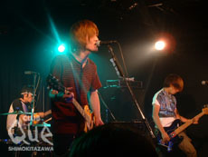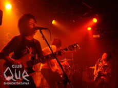 CLUB Que夏の陣2日目は、OO TELESAとGRiP。まずはOO TELESA。今年ここCLUB Queとロフトでワンマンを行い確実に成長を見せる彼等。師匠曽我部恵一氏も見守る中、勢い良くステージに飛び出してきてまずは円陣を組む。なんとも彼等らしいパフォーマンス。驚いた事に黄色い声援に混じって野太い声。そう言えば以前には見られなかった男性のお客さんもチラホラ。それも各地で鍛えられたライヴのおかげだろう。いざライヴ始まるとのっけから全身全霊でかなりハイテンション! OO TELESAらしい懐かしいメロディに優しい日本語の歌詞。思わず口づさんでしまう特別じゃない等身大の言葉。彼等の唄を聴くととても優しい気持ちになってしまう。ライヴはもうテンション上がりっ放し。上がり過ぎてMCなんかはほとんど聞き取れない(笑)。たぶんお客さんより演ってる本人達が一番楽しいのだろう、そんな彼等を見てると自然とニンマリしてしまう。次はGRiP。去年、今年と必ずと言っていいほど記念イヴェントに顔をだしている彼等。バンドは結成してまだ2年足らずにも関わらずステージで魅せる彼等のステージパフォーマンスは見る物を虜にする。女性ファンが多いのはそのルックスにあると思うが、演奏はスリーピースとは思えない程の音圧。何か尖ったものを投げ付けられたかのような荒々しいギターサウンドに心地よいグルーヴ。その音に身をゆだねるとどこかに落ちてしまいそうになる。また絶妙な曲間の取り方、卓越した演奏技術、曲構成の絶妙なバランス、どれを取っても余裕のステージングだった。00 TELESAが全14曲、GRiPがアンコール含め全12曲、時間にすると2時間強のライヴでとても心が満たされた。"RETURN TO NATURAL 2003 CLUB Que 夏ノ陣" "2003 VS SERIES" GRiP vs OO TELESA