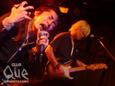 今年もやってきました“RETURN TO NATURAL 夏の陣”。と言えばVSシリーズ。まずはRadio Carolineである。パッチとウエノコウジとMr. Sheenと言う一見異色な組み合わせにも思えるが、いやこれがばっちりはまり過ぎている。激しいながらも確実なリズムを刻むドラム&ベースで完全に作り上げ、パッチの強力なギターヴォーカルでその世界が無限大なものになる。とてもやばい物を観てしまったと言う感じ。いつも思うが、人を引き付けるもの(魅力)って相当な力だ。このバンドのそれはまだまだこんなもんじゃないと感じたのは私だけではないはずだ。続いて「どーもこんばんわ!」と登場した怒髪天。増子氏を見ると何故だか安心する。いつでもファンの期待を裏切らず、それ以上のものを与え続ける彼等。好きな音楽に対して妥協せず徹底的に演る様は、ちょっとくらい懐かしい味がしても切なくてもほろ苦くとも全然おかまいなしだ。むしろそうではないと意味がなく、もの足りないのである。ちょっと意外だったのはファンの年齢層が予想より若かった事。やはりいいモノは受け継がれていくんですね、増子兄イ! そしてこれが本日の目玉? 特別企画。CLUB Queの9周年で二位店長が監督を務める映画のライヴシーンの撮影(※1)。ヴォーカル増子さん、バックがRadio Carolineの面々(※2)。これまたやばいものをしつこいくらいに堪能させてもらいましたよ。観てない人、観れなかった人は映画で楽しむと言う事で!"RETURN TO NATURAL 2003 CLUB Que 夏ノ陣" "2003 VS SERIES" 怒髪天 vs Radio Caroline