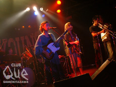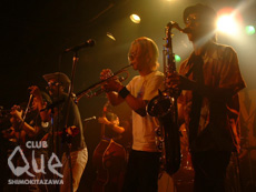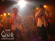“夏のVIVA YOUNG! 5DAYS”4日目でもある、ONE DAY SKA GOIN’。スカNIGHTということでドッキドキな気持ちでQueへGO~!!!!!! みんながまったーりと踊っている中、一番手に登場したのは8人編成SHOPLIFTER。赤の照明がとってもよく似合う情熱的で大人なスカロック。踊れるネオスカポップチューン『SUNSET BEACH』がお気に入りになりました。 お客さんもゴキゲンなのかそこら中で乾杯が(笑)。あたしもビール買いに行こっかな~っと思ってると、24/7が登場。男気がにじみ出ているボーカルが 「おれがいちばん楽しい!」というように最高、笑顔なライヴをプレゼントしてくれた。ゴリゴリ、メロな軽快スカナンバーに会場中が踊りまくった! 暑い(熱い)ぜっ、24/7!! 続いては音楽って本当に自由だな~と体と心で感じさせてくれたTuff session。レゲエな感じの弾む包み込んでくれるメロディーが優しくて……、ちょっぴり切なくなった。イノセントな気持ちになれたよ。 気付くともう最後。トリを飾るONE TRUCK MINDがヘルメットをかぶってステージに!! (笑)。みんな満面の笑みで彼らを迎える。ステージと観客に全く温度差を感じない、勢いありまくりの ライヴ!! やばいよっ。めちゃロックだ。みんなパーティーのような大騒ぎ!! 最後までテンションが落ちることなくライヴは終了しやした。今日の酒は特にうまかったデス。この夏、最高の思い出になりました!ありがとー!"夏のVIVA YOUNG! 5DAYS ~ONE DAY SKA GOIN'~" ONE TRUCK MIND/24/7/Tuff session/SHOPLIFTER