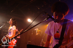 この日のイヴェント“very berry pie”は、“ポップ・ミュージックを広げよう”というコンセプトのもとに始められた、dizzy sweet HAとsalt water taffyによる共同企画で交互にイヴェントを企画するという不思議な形態。第1回目のこの日はdizzy sweet HAだけが出演し、第2回目(10月16日)はtaffyだけが出演するそうだ。トップ・バッターは白いシャツに黒マントという衣装を着込んで、ドラえもん(?)のお面を被って客席から登場したエレキベース。とにかく登場から強烈で、ロックンロールを演奏してもどこか懐かしさと楽しさを含ませたポップ感と、自由に楽器を操る柔軟さが印象的だった。続いては本日の企画バンドdizzy sweet HA。客席からの歓声もひときわ高くなる。のびのびと歌う女性ボーカルの爽やかさと徐々にポップさを増していくステージは、彼らが“ポップ”をイヴェント・コンセプトとした理由を自ずと見せているように思えた。そしてラストはNORTHERN BRIGHTである。彼らのライヴは圧巻のひとことだった。不変的だったしどこか穏やかさが感じられた。不変的であるから、穏やかさを感じる事が出来るのかもしれない。……この日出演した3バンドのポップの定義。一言でポップと表わしても様々な形があるのだと、イベントが終わって改めて感じた。"very berry pie. 1piece" エレキベース/dizzy sweet HA/NORTHERN BRIGHT