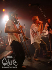 今回の“CONVERSE ROCK 009”はTHE JERRY LEE PHANTOMとDOMINO88の最強ダッグによるスペシャルONE DANCE NIGHT。お客さんもそれぞれのTシャツ、タオルなどを身に付け準備万端!私もクリスマス前の浮かれた下北沢同様ドキドキしながら待ってるとDOMINO88が登場! みんな一気に前に押し寄せる。総勢8人のステージは少し狭そうだったけど“POP! POP! Do you wanna pop?”と弾けたスカサウンドを聴かせてくれる。楽しい~!! MCでは、クリスマス・イブイブなので靴下に入ったハンバーガーを中国地方在住の男性にプレゼントしてました(笑)。優しいなあ。ラストの「Ring Ring Ring」ではQueにサークルができて、真ん中で男の子が踊っていてかなり楽しそうだった。みんなイイ顔して回ってたな~。会場中がハッピーで溢れてました。そしてTHE JERRY LEE PHANTOMがステージに。今日はジョーストラマーの命日の翌日ということで、THE CLASHの「BRAND NEW CADILLAC」からスタート。 DOMINO88のVo.キヨシも“楽屋で踊りまくる!”と言ってたように客席もダンスの波! 彼らのテクノやパンクなどをおりまぜたハイセンスな音世界に夢中になって踊り続ける。全身にカミナリが落ちてきたような衝撃を感じる、圧巻のステージングに息を飲んだ。体の奥までばっちりしびれて全13曲+アンコール1曲でライヴ終了。みんなの「もう一度会いたい」という熱気が伝わったアンコールの声に感動しました。最高のダンスミュージックに酔いしれた、素敵な一夜をありがとう!!"CONVERSE ROCK 009" THE JERRY LEE PHANTOM/DOMINO88