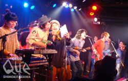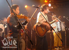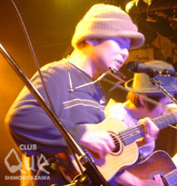 サード・クラスpresents"不思議な正月の夜 vol.2"。はじめに登場したのはスカーフカー。2曲目の歌が聴こえるまで、なぜだかすごく緊張。メンバー全員があまりにも真剣だったので、その気迫に圧倒されたというか。だから、歌を聴いてものすごくホッとしたのだ。そこから急に空気がやわらいだ気がする。どこか懐かしくて、ちょっと淋しい気持ちを思い出させるメロディー。時間を忘れて遊んでいた頃の夕暮れの感じかな?「ひばり」という曲でささやくように、物語を伝えるようにうたうボーカルがとても印象的だった。2番目にひとり、ウクレレを持って現われたのは知久寿焼さん。声が持つ力の大きさを感じた。こんなにシンプルな編成でここまで想像力をかきたてられるんだ。3曲目からスカーフカーでバイオリンを弾いていたムトゥさんが参加。5、6曲目はスカーフカーも全員参加。たまの曲で有名な「ロシヤのパン」を披露し、盛り上がったところで最後の曲「夜の音楽」。キレイで悲しくて胸が痛い。最後まで声に気持ち良く翻弄された。3番目に登場は本日の主催者、サード・クラス。さっきまでのふんわりムードとは一変、エレキギターがガツンとくる。まずはお客さんを巻き込むようなアップテンポの曲でつかんだ後、しっとり目の「おぎなう」。「深呼吸」は広い草原をイメージさせるような広大な感じのする曲。そこで一息ついたあとは、たたみかけるような曲が続き、見てる方も走り出さずにはいられない! 主催者が熱ーく盛り上げてくれたところで、最後に登場はワタナベイビー。バックにはサード・クラスのメンバー。3曲目「スマイル」で場もあたたまったところで、未発表曲の「真っ白な時間」「恋のメロディー」を披露。両方とも恋する切ない、けど楽しい気持ちを歌ったかわいらしい曲。あれ、もう終わりなの? って感じで、最後の曲。ゲストに50ccの森くんが登場!笑わせてくれる。アンコールは今日2回目の「スマイル」。本日の出演者にプラス、ゲストの森くん、TOMOVSKYも参加してのにぎやかであたたかーいアンコールだった。タイトル通り不思議で、あたたかくて居心地の良い夜だった。"不思議な正月の夜 vol.2" サード・クラス/知久寿焼/ワタナベイビー/スカーフカー