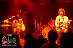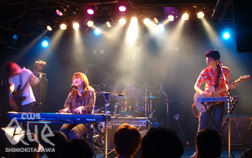 あれ?ココCLUB Que?会場には椅子とボサノバ調のBGMに包まれ街角のcafeに来たような錯覚に陥る。本日の出演者にピッタリで嫌が応にも気分が昂る。トランペットが入る“Letters”から爽快なスタートを切る岩見十夢君。本日からサポートにエレキギターが入り、のびのびと唄に専念する彼はナントも心地良さそうだ。「じっくり聴いて欲しい曲」と紹介された“君の歌が聴きたい”。スウィートボイスで何度も繰り替えされるこのフレーズは、一回ごとに意味を持ち感情を昂らせる。恋している女の子はきっとノックアウトさせられちゃうよ。続くは楽曲から四季を感じさせてくれるwaffles。彼等の夏チューンだという“LIFE”は軽快なギターが印象的で、真っ青な空の元でドライブでもしたくなってしまう。そりゃあG.ジョナのアロハも冴えるわけだ。ラストの“たびびとよ、青へ”は、vo.&key.の恭ちゃんが「大切にしている」という一曲。私は彼女の使う“僕”をいう響きが好きだ。全身で切なさや喜びを素直に彼女の唄が大好きだ。“僕に勇気をください”と唄う彼等に、気付くと目頭を押さえていた。トリはベベチオ。ギターとベースから良質なサウンドを紡ぎ出す関西の2人組。シンプルながらもハスキーな歌声で厚みと存在を際だたせる。彼等の唄にある何気ない恋人との風景はあまりにも日常ゆえ、詞の世界にリアリティが生まれるのであろう。ラストの“涙橋”を超えて、何だか勇気を手に口笛を吹いて歩いて行きたく思えた。繰り返される日常にスパイスのきいた温かい夜だった。"ALIVE!" 岩見十夢/ベベチオ/waffles