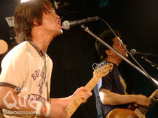THE CLASHをBGMにメンバーがステージに現れると会場内の温度がぐんっと上がった。オレンジのライトに照らされて、4人の気合いが透けて見えるようだ。ザ・カスタネッツワンマン2days初日。力が入るのも当然だろう。『モノクローム』から始まって、2曲目『ムーンパレス』で早くも力強く、伝わる、届く歌に圧倒された。Vo.牧野元、あいかわらずの存在感。光をたたえた目で真剣に唄っている時も、ゆるいMCの時も、バカをいって笑っている時も。ただそこにいるだけで人を惹きつける魅力をもっている。会場中に笑顔が溢れているのは、元ちゃんに幸せにさせられているからではないだろうか。G.小宮山さんがリードヴォーカルをとったファンキーなナンバー『リッパ』では、本当に楽しそうにハープを吹いていた。そんな姿にまた笑顔がこぼれてしまう。ライヴ中盤に披露されたニューシングル『サンシャイン』は、そうゆうキャラクターと流れていく日々がそのままメロディになったような曲。メッセージがひしひしと伝わってきて「また聴きたい、もっと聴きたい!」と思わせる。これはカスタネッツの代表曲になりそうな予感。後半は『ハック』や『青と白の日々』でスピードを上げつつ、カスタ節全開という展開になった。『フィクション』では勢いがつきすぎて歌詞がとんでしまい、フロアに助けを求める、なんて場面も(「忘れてください」と言っていたけれど、忘れませんよ!)。本編最後はシングルのカップリング『また明日』で締めくくった。本当に明日またこの4人に会えるのだから、うれしいことこの上ない。「また明日」。さりげないけれど、約束が本当になるのなら、とても素敵な言葉だと思った。"ザ・カスタネッツ シングル発売記念 ~パトロールツアー2005~" ザ・カスタネッツ