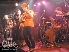 まずはMagnumBOWL・がお揃いのボーリングシャツを身に纏って登場。今年3月のQueでのワンマンライヴはソールドアウト、今めきめきと力を上げてきているバンドといっていいだろう。この日も彼等は全力投球! 定番「あの風」では会場が一体となって手を横にふる振り付けがあったりと、元気な曲では皆を楽しませてくれる。しっとりとした曲もボーカル今井さんの伸びのいい声でしっとりと聴かせてくれる。そして、マグナムは一人一人キャラがたっているところがまたいい。ステージ上の5人は眩しいくらいにキラキラしていて、まだまだMagnumBOWL・という音楽のおもちゃ箱からは見たことのないおもちゃが溢れてきそうと思わずにはいられなかった。続いて、ハックルベリーフィンの登場。ハックルはいつも見ても変わらない素敵な音を私達に届けてくれる。「アクアラング」に始まり、「beautiful day」まで、この日は夏の曲を盛り沢山でお届け。実は個人的には明日から夏休み♪という状況でこのライヴに足を運んだのだが、正に夏休みの幕開けを感じさせるワクワク感が吹き抜けて行く。夏ノ陣のパンフにも書いてあった通り、「必要以上に汗だく」!そんな夏に弱いハックルの夏の曲は、なんとも素朴でちょっぴり情けないような、青春の匂い。気持ちがあったかくなって、笑顔が溢れてくるのだった。きっとこの場にいた皆、ライヴを見終わった後は爽快な気分になったはず!マグナムもハックルも、突き抜けるような夏の爽快さを運んできてくれたのだと思う。そんな2バンドの共通点を感じた一夜であった。"RETURN TO NATURAL CLUB Que 夏ノ陣 2005 ~VERSUS SERIES~" ハックルベリーフィン vs MagnumBOWL⑧