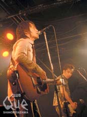 かつてGRiPのVo.権田タケシはDUSKでギターを弾いていたことがあった。加えてライヴ当日発売だったSplit.CDも一緒に作ったりしてるのだから、この対バンなかなかの因縁ぶりではないか? 先陣を切るのはGRiP。ルックス甘めなのに音はどっしり重い。3ピースの良さ全開のシンプルでわかりやすく、かつ熱いライヴを展開する。後半はマイク2本手に持って熱唱したり“Come on,Everybody”のカヴァーもありで、がっちり盛り上げてトップバッターの責任を果たしてくれた。転換も終わり、SEにかぶせるようにギターのフレーズが鳴るとじわじわとDUSKのカラーが流れ出す。ネクタイ姿(GRiP初期を意識!?)のジョウミチヲが現れると、そこからは一気にDUSK WORLD。自分たちの世界はそのままに、曲ごとに違う空気を醸し出すメリハリの利いたライヴを見せる。こんな器用なことができるのはメンバーひとりひとりが芸達者なDUSKならではだ。中盤に演った“Untoched Sky”はそんなDUSKの真骨頂ともいえる曲。観るものをグッとステージに引き寄せた瞬間だった。本編最後は「一番最初に、権田くんが手伝ってくれているころに作った曲」という“A Couch”。因縁の…いや、関係の深さを感じさせるいいラストだった。アンコールでは両バンドの全員がステージに上がってSplit CDの最後に入っている曲(なんの曲かはCDを聴いて欲しい)をセッション。気の合う仲間が集まって好きな曲を好きなように歌っている、そんな楽しい光がステージからあふれ出していた。"RETURN TO NATURAL CLUB Que 夏ノ陣 2005 ~VERSUS SERIES~" DUSK vs GRiP