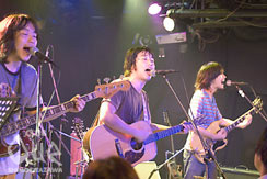 溢れんばかりの人で埋め尽くされたこの日。まずはbonobos。軽やかなリズムと伸びやかな歌。歌うその“太陽”も彼の目には見えているのだろう。『午前の光』の美しいコーラスから、パーティーのカウントが始まる。ミラーボールが回り出せば、虹色のライトが彼らを照らして、「踊れ!踊るんや!!」蔡の一言で、さぁ始めよう!『今夜はGroove me』、楽しい夜を。一人一人の身体の揺れが連なって、大きな幸せを生む。しっとりと聴かせる歌も挟みながら、ラストは『THANK YOU FOR THE MUSIC』。何でもない日常に、私たちと同じ目線でのミュージック。それはきっと多くの人の夢が詰まったものなのだろう。対するはトランペットとサックスを交えたバンドセットでの曽我部恵一。「OK!C'mon!!」この一言で、現実も抱えてるものも全て吹き飛ばす。ステージから向かってくるパワーが別世界へ連れていく。『シモーヌ』そのメロディーこそが愛。音と音の隙間から溢れてくるもの、それが愛。この人の大きさを改めて思い知る。そして言葉を確かめるようにして始まったのは『浜辺』。“夜を越えて”繰り返されるフレーズに酔い、辿り着くのは静かな海。それでもなお、争いや戦いの耐えない2005年初秋に聞く『ギター』は、みんなの胸にどんな風に響いたのだろう。だからこそ“Everithing gonna be alright”呪文のように祈るように歌う。最後は『Stars』。瑞々しさと生命感で空間全てがキラキラに光る。そしてこの身体に流れる血のあたたかさをしっかりと感じて、素敵な夜は更けていった。"CLUB Que 11th Anniversary FES. ELEVEN ROUNDS of GROUNDS" "RUNNING MAN" 曽我部恵一/bonobos