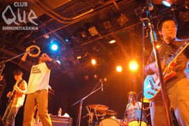 ザ・カスタネッツのライヴに行くときはいつも、元気と笑顔をもらいたくて会場に足を運んでいる。「パトロールツアー2005~秋の巡回ワンマン~」最終日。1曲目の"フィクション"から、体をいっぱいに使って歌うVo.牧野元はこっちの期待以上のものを投げ掛けてくれる。ツアーのラストスパートといわんばかりにスピード感溢れる選曲。しかし、ただ突っ走るだけではなく、途中、客席にガシャポンを投げ入れるシーンがあったりと、和ませムードも忘れていない。会場全体が暖かく安心で、居心地がいいのはやっぱりそこにいるのがカスタネッツだからだ。"気分屋さん"では、ファンにはすっかりお馴染になった振りで盛り上がり、続く"リッパ"でも「R・I・PPA!」の振り付け指導が。こういう時はもう文句なく楽しい。みんなの笑顔が自然と大きくなっていた。楽しい時間はあっという間に過ぎ、本編最後の曲になった。今までの冗談まじりのMCとは一転、真剣な眼差しで「ありがとう」と言ってから始まった"Through"。今出せる力と声の限りに歌われたこの歌に思わず鳥肌がたった。元気と笑顔だけでなく、力までもらった瞬間だった。2回目のアンコール、最初は牧野さんとG.小宮山さんふたりだけという珍しい形で始まった。2曲目の"変りゆくいまよ"の途中からメンバー全員がステージへ。再び4つの音がひとつになって会場中を包みこんだ。「観てよかった。ありがとう!」と心から言えるライヴだった。またすぐにザ・カスタネッツに会いたくなった。"パトロールツアー2005 ~秋の巡回~" ザ・カスタネッツ -2DAYS-