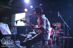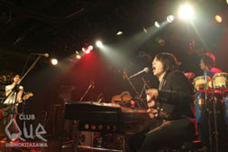 “THE IDEAL ROCK TODAY”と題された今夜のイベントは、まさにその名に相応しく、タイプの違う3組が理想的なロックを鳴らしてくれた。最初に登場したのは、赤松クニユキ(サンダルバッヂ)+丸尾和正(Clingon)のユニット= 赤丸!VJが映し出す映像と共に、心をぎゅっと掴むギターのメロディと、優しく響くドラム、圧倒的な歌声が重なって、濃密な空間が作り上げられてゆく。最後は赤松が「皆と糸が繋がるといいなと思って作った」という曲“糸”が演奏され、あたたかい雰囲気を残して2人はステージを降りた。続いては近藤智洋BAND!ポップ/メロウ/バラードあり、ポエトリーリーディング調の曲もありと、幅広い音を聴かせてくれた彼ら。近藤がギターをキーボードに持ち替えたラストナンバーでは、「下北沢ダンスカーニバル、OK?」という近藤の掛け声に応じて踊るフロア!6月に発売予定というアルバムへの期待をしっかり抱かせてくれるステージだった。 最後は塚本晃の新バンド=NOWHERE!塚本が「デビューライヴという新しい船出に相応しい天気(笑)」と今夜の雨を皮肉るMCで笑わせてくれる。「バンドになったからって全然変わってなくてすみません」と語っていたが、相変わらず円熟したロックを鳴らした彼ら。5/24にリリースされるというアルバムも楽しみな限りである。空模様は生憎の雨だったが、そんな雨の音すら心地よい響きに変えてしまうような心地よいロックに包まれた今夜だった。"THE IDEAL ROCKING TODAY" NOWHERE[塚本晃(vo.g)、三輪雅也(b/vo)、伊藤孝喜(dr)]/近藤智洋BAND 赤丸[赤松クニユキ(サンダルバッヂ)、丸尾和正(Clingon)]