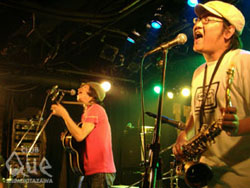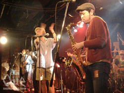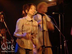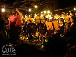 ステージには御馴染みVIVA YOUNG!の幕がドーンと構えている。しかし、その前にはたくさんの譜面台。そして、いつも自分が遊んでいる場所に自分の親と同じ位の方々が集まり、始まりをニコニコと待っている。Queは一歩入った瞬間にしていつもとは違う雰囲気。まずは店長二位さんと、ビバヤング主宰・倉山さんが登場し、出会いは3年前の北沢音楽祭と特別なこの日の説明を。トップバッターは富士中学校ブラスバンド部の皆さん、羽織袴姿の吉田先生の指揮の下「マツケンサンバ」や「世界にひとつだけの花」を演奏。途中卒業生の紹介もあり。あたたかい空気をいっぱい残し、ベイビー&さいだぁへ。彼らの衣裳は御馴染み学ラン。リハーサルから衣裳着用で挑んだと言う彼ら。「こんな大人になるなよ~」と言って新曲の「僕は脱落者」を披露。続くCaSETTE CON-LOSは、「いろんな大人がいるだろー!将来こんなふうになれ!!」と、これからへの渇を。最後は24/7with宍戸留美。御馴染みの組み合わせかと勝手にイメージしていたら、なんと初競演だそうで驚き。今後も見たい組み合わせでした。倉山さんからは、自由に楽しめ!とスカのレクチャーもあり。それを最前列で笑顔で楽しむ卒業生のみんな。そして、最後は出演者総出演で「聖者の行進」を。みんな良い笑顔だ。娘:「ねぇ、脱落者のTシャツ買っていい?」母:「しょうがないわねぇ」って。これ、終演後、実際にあった親子の会話...。...あはは(笑)卒業おめでとう!楽しい夜をありがとう。一瞬にして繋がれる音楽の魔法を改めて感じた夜。こんな大人達も良いでしょ?!卒業への祝福とこれからへの激励が混ざり合うとても素敵な空間でした。"VIVA YOUNG! Graduation 06" 24/7/CaSETTE CON-LOS/宍戸留美 ベイビー&さいだぁ/富士中学校ブラスバンド部