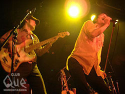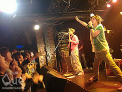 「活洸ノ湊」と名付けられた今夜のスリーマン、一番手は年間100本以上ものライブをこなしてきたという勢いのあるバンド「THE RODS」。地面の下から突き上がってくるような演奏と、Vo.陶山さんの少ししゃがれた歌い声が奏でる切ないラブソングが聞く者の心に響いてくる。MCで、ちょっとした「いざこざ」があったけど、それでも我々は努力して頑張っていくんだ~みたいな事を言っていたが、RODSの曲の中で感じる一瞬の静寂は、メンバー全員が同じ気持ちで演奏してるんだということを感じさせられる。頑張れRODS!続いて登場したのは、「パイナップルフリーウェイ」。Vo.シンさんのとてつもないハイテンションに圧倒されっぱなし。ここはジャングルジムかと思ってしまうほど、天井をうんていのように移動する。そんな姿にハイテンションが客席へと飛び火し、いつの間にか全員が一緒に歌って踊っていた。恐るべしパイナップルフリーウェイ。彼らの歌を聴いていると何故か恋がしたくなるのだ!男友達に向けて作った歌「ブラザーブラザー」も印象的だった。そして、ラストは「スキップカウズ」。イマヤスさんは、今夜の最後にふさわしい艶やかな?ヘアスタイルで登場し、セクハラテーマで一気に会場のみんなを虜にしてしまった。キラキラ光るピアニカで「夜の風」をしっとり歌い上げるかと思いきや、お客さん全員とのスキンシップタイムとエコロジカルな分別ソング。お客だからといって後ろの方でのんびりしていてはいけない。イマヤスさん自らライトを客席に当て「お前も歌え!」と来るのだから。そんな盛りだくさんな対バンに我々は大満足だった。"油汗泥汁 其の十九 ~活洸の湊~" SKIP COWS/パイナップルフリーウェイ/THE RODS