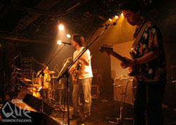 会場へ入ると、ステージ前方に1列12、3脚の椅子が3列並んでいて、ステージ上に設置されたスクリーンにはプロジェクターで「東京ローカル・ホンク」「クワイエット・ロックンロール」の白い文字がくるくる回ったり、波打ったりしている。なんだか別のハコに来ているようで新鮮。この日は4人組ロックバンド、東京ローカル・ホンクのワンマンライブ。取り敢えず下手側の椅子に腰掛け、回る文字に見入る。サブリミナル効果でどうにかなってしまいそうになりつつ開演を待っていたら、オンタイムでメンバーが静かにステージ上に現れ、フルアルバムの1曲目でもある「お手紙」でライブスタート。爽快感溢れるサウンドとボーカル木下の抜けのいい美声が響き渡り、フロアには温かな笑顔が咲き始める。恥ずかしながら彼らのライヴは初見であり、今日に至るまで楽曲すら耳にしたことがなかったのだが、みるみる東京ローカル・ホンクの世界に引き込まれ、自然と体がゆらゆら揺れる。「知ってる人は一緒に歌ってくださいよ!」という一言で始まった「おにぎりソング」は思わず駆け出したくなるような軽快なリズムが印象的。「ブラック里帰り」の詞は着眼点が非常におもしろく、「あんた就職せえへんの?」なんて歌われたら自分苦笑するしかなかったっす。この日は休憩を挟んでの二部構成ライヴとなっており、第二部の始まりが強烈。声によるインプロビゼーション。マイクスタンドにつるされた鈴の音と、木下のギター以外の楽器演奏はなく、「あー」という声を4人それぞれが様々な音程で歌い上げるという実に実験的なパフォーマンス。彼らの綿密に折り重なるコーラスワークには脱帽。一朝一夕で身に付くもんじゃない。そこらのコーラスとは年季が違う。新曲「四月病」も交えつつ、「いつもいっしょ」で本編は終了。すぐさまオーディエンスからアンコールを求める拍手。しかし拍手が始まってあんなに早く出てきた人たちを見たのは初めてだ。「この後もイベントあるからケツカッチンなんだよ!」だって。最後はjesse davisの「Make a Joyful Noise」をカヴァーし、無事ライヴ終了。そうそう「おバカさん」をやる前に木下が「メンバー4人を題材に曲を書いているので、曲中に登場するおバカさんか誰か考えながら聞いてください」と言っていたのだが、ライヴの帰りにマクドナルドに入ってレジで注文を済ませた直後に財布に100円しかないことに気付いた私が1番のおバカさんであることは間違いない。"東京ローカル・ホンク ワンマンライブ ~クワイエットロックンロール 2006~" 東京ローカル・ホンク DJ>増岡一郎(ペリカンオーバードライブ) VJ>ドリーマー