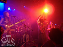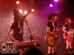 CLUB Que恒例イヴェント"VIVA YOUNG!"。会場に入ると壁に落書きコーナーが設置されていたりして、お祭り気分を盛り上げている。3Daysの先陣を切るのは福岡からやって来た女子4人組Thee 50's high teens。そのルックスからは想像しがたいパワフルなダミ声で場内を圧倒する。女ドラキュラとメイドを混ぜたような小悪魔風の衣装でもちっとも媚びているように見えず、むしろ彼女達の凄まじさを際立たせている。フロアにいた女の子からこんな声が漏れた「すごいカッコいいよー!」。気づけばステージ前は踊り狂う人でいっぱいになっていた。出番が終わってからも興奮冷めやらず、なんとアンコールが! 1バンド目からアンコールなんて観たことない! 10月で現メンバーでの活動は休止となるが、絶対に違う形で戻ってきて欲しい。Vo.エミがフロア側から登場して始まった2番手ズクナシも女子バンド。ファンキーなリズムで、のっけから観客を揺らす。初めて音源を聴いたときは「和田ア○コ!?」と思ったが、実際に聴くとそこまで男っぽくはない。ほどよい太さと高さを持つ声が気持ちいい。観ていると、この人は本当に歌が好きなんだなぁというのが伝わってくる。最後はステージから降りて、お客さんと一緒に歌って弾けて本物の笑顔でステージから去っていった。トリを飾るのはオーサカ=モノレール。ムーディなイントロをたっぷり見せた後、ヴォーカル中田亮氏が出てきたときの印象は「うわっ、なんか出てきた!」。それくらいの大インパクト。無表情でビシッと揃った振りを繰り広げるホーン隊の動きからも目が離せない。思わず一緒になって踊ってしまったりすると、オーサカ=モノレールの作戦にまんまとはめられているような気もするが…。う~ん、怪しい、でもなんか楽しい! 本気で遊べる大人と空間を共有できるのはなんてハッピーなのだろう。大いに踊って歌って幕を閉じたVIVA YOUG!初日。この幸せは、あと2日続く。"VIVA YOUNG! 3DAYS 06 ~SOUL SHIMOKITA!~" オーサカ=モノレール/ズクナシ/Thee 50's high teens