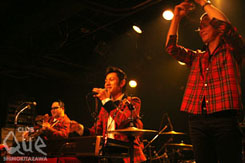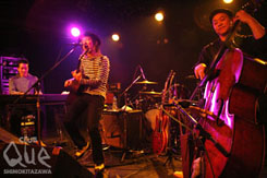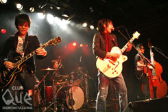 開演前からROCKERなお客さん達で熱気ムンムン状態。 3/14に1stAlbum「POP SAVE US」をリリースし全国ツアーを敢行する、HARISS主催のイベント。トップバッターは大人の不良(?)自称「華麗な一味」の「JUNCO PARTNER」。曲が始まれば、空間はまるでライブハウスでは無く、何処かのジャズバーのような雰囲気だ。太い声援の飛び交う中、「ロマンチック泥棒」等全7曲を演奏、最初から最後まで賑やかで華やかな演出。続いて「浜辺シゲキ」。曲も演奏もバンドより一層繊細な印象、別の表情を魅せてくれている。フラメンコのような調べ「Lantern」からスタート、この曲はインストだがギターが歌っている。そのテクニックの高さと彼の持つ瀟洒な雰囲気にまたもやここは何処?となってしまう。バンド間はDJ:SATO(URASUJI)が、ホットな空気を醒ます事なく逆に加温して引き継ぐ。トリは「HARISS」。NewAlbumより「LOVE SAVE US」からスタート、最初からテンション高くキラキラをばら撒く。同じくAlbumより「内心ガール」、SEIJIがVoをとる「HEATWAVE」、カバー曲「HUSH」等、怒涛の進行だが疾走感さえ溢れる他には類を見ないバンド、HARISS。 4/28ワンマンライブ@CLUB QueでHARISSワールドを体感する事は、日々の生活の活力になる事、請け合い。"POP SAVE US vol.7" HARISS/JUNCO PARTNER/浜辺シゲキ[with TONE&MABO(THE88)] DJ>SATO(URASUJI)