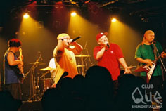 やって来た、通称「鬱陶しい夜」『あかね色の海PART1』。トップバッターは、全員100kg超のスーパーバンド「デブパレード」。ハンヂ他4名みんな大っきいけど、リズミカルでダンサブルでどすこいで。飲み物を注文する時は「とりあえずカレー」、来るべきデブームに備え着々と準備中らしいが、目前に控える夏に少々及び腰の「夏の終わりに」。Tシャツの標語は「全ての武器をお箸に」。あっという間に取り組みが終わり、次は「パイナップルフリーウェイ」。一曲目から汗だく「VS.GS」、汚れない心が伝わる「ロックンロールハート」、鏡を見て自分を好きになる努力をしたらしい「レモンハート」、お馴染み「ロック少年」~「ぴーぴーぴー」「ブラザーブラザー」、観てると汗だくで暑苦しそうだけど、温かい音楽がジワジワと身に染みる。そしてトリを飾るのが、今年10周年を迎える千葉代表「スキップカウズ」。相変わらず、切ない男心を歌ったら右に出るものはあんまりいない。何年も演ってる曲を聴いても、初めて聴いた時と同じ感覚を受ける。2曲目「二日目のカレー」って、デブパレードの曲かと思った。180cmの大仏の歌「鎌ヶ谷大仏」、ネーミングセンスも抜群に地域密着型。出た!「スキンシップタイム」!これ、いつから恒例なんでしょうか。やたら派手な格好で「よーしよしよし」とフロアを練り歩いている。続く「裏切りのうた」でお客さんが手を振るところが、まるでリハ済の様に美しい。本編ラストの「スルメ男」ではスルメになったイマヤスさんに、さっき配られてたお菓子(スルメ)がマジ投げされてて、痛そうだった。アンコール「チャック全開」、最後引っ張りまくってて面白かった。お疲れ様です。今日は3バンド共、確かに暑苦しい感じだったけど、何て云うかサウナみたいな感じで、後はすっきり爽快で元気になれる、そんなバンドばっかりだったと思う。"あかね色の海 PART1" スキップカウズ/パイナップルフリーウェイ/デブパレード