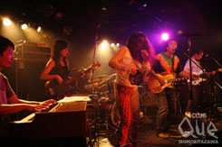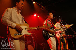 会場の雰囲気がいつもと違う。落ち着いた年代のお客さんがグラス片手に語り合っている姿が目立つ。今年四月に亡くなったロック研究家、黒沢進氏に捧げるものだからだ。GS再発見に多いに貢献した彼の著書には「日本ロック紀GS編」「日本フォーク紀」等がある。DJは湯浅学とサミー前田。このイベントに相応しい曲が流れる中、若者を含め幅広い年代の客が続々と詰め掛けて来る。再々結成となる「北久保誠とザ・ガリバーズ」から始まったライブはものの見事に我々を60年代へと導いて行ったが、そのメロディーは当時を知らない若者には新鮮に映ったに違いない。「田渕純とムードアンザンブル東京」ではアーバンムード歌謡の貴公子と言われているVo.田淵の甘い歌声にしばし酔い、途中ゲストで現われた渚ようこは舞うように観客の声援に応えながら何曲かを歌った。「瀬川洋[森園勝敏(g/四人囃子)、湊雅史(dr)、シゲ(b)、須川光(key)]」は次々と飛び入りゲストを迎え楽曲と共に人数でも華やかさを添え、会場のあちこちでは笑顔でスウイングする人々が。トリを飾ったのは「ナポレオン山岸(g)+サリー久保田(b)+チャーリー森田(dr/ex.ザ・ファントムギフト)」。彼等のひと味違うサウンドに聴き入る客達。諸先輩方を前に恐縮した様子でアンコールにも応え幕を閉じた。出演者それぞれが黒沢氏との思い出を語り、会場と心を一つにして盛り上げたこのイベントは深く心に残るものとなった。