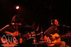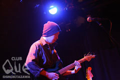 穏やかなBGMが流れ、モニターには淡い色彩の映像が映し出されていた。そこかしこに配置された観葉植物たち。照明の落とす柔らかな光がその鮮やかな緑をたたえている。この日のQueは普段とちょっと違った装い。テーマはなんと「お庭」なのだ。心配りの利いたドリンクとお惣菜のもてなしに、開演前から歓談の輪が広がる。そんなリラックスムードの中、最初に演奏を披露したのは浅野達彦。ループする浮遊感のある電子音が背後に流れ出すと、それにギターの演奏を沿わせていく。やがて重なり合う残響。少しずつ変化してゆくリフレインはとてもドラマチックだった。二番手のTHE YOUNG GROUPは、美しいメロディを淡々と紡いでゆく。ギターのユニゾンとウィスパーボイスがそこはかとない詩情を漂わせていた。続くもてなしはキノ・イグルーによる短編映画。日本のものと海外のものを合わせて4作品が上映されたが、いずれも多彩な魅力を放ち、音楽ライブとは違った方法で感性を潤してくれる。最後に登場したのはホストのQuinka,with a Yawn。ゲストにコケストラを交えて披露されたバンドのアンサンブルはオーガニックな雰囲気を醸し出していた。たおやかな歌声と澄んだコーラスが綴るのは日常の歌。ありふれた日々に光を当てるその音楽は、とても包容力を感じさせる。背伸びをしない、等身大のおもてなし。けれど、それはまるで陽だまりで背伸びをするような温かな心地よさがあった。
