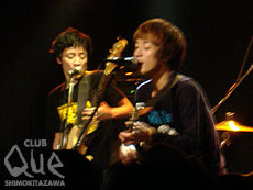 クリスマス!つー訳で世の中にはウカレタ男女がお菓子業界の陰謀にまんまと乗せられて、必要以上の甘味な食べ物を食べ、2月頃からダイエット食品などにお金を費やすという新たな食物連鎖が起きてる現代ですが、CLUB Queも多分にもれず甘めのチョイス…という訳でも無いな~。おとぎ話とTOMOVSKYという組み合わせ。和洋折衷で隣のお兄ちゃん的な、そう食べ物で言うならラーメンかな。こだわりのオリジナルスープをお仕着せがましくなく美味しくいただけるラーメン屋さんだね。まず1杯目はおとぎ話。独特のタイム感の中に、Voの有馬君のポップで伸びやかな麺…じゃなくて声が特徴的。それよりステージを楽しんでいる顔がすごくすてきで、もうイケ麺じゃないのが逆に最高で、もじゃもじゃラーメン・ヘアースタイルは70年代の空気をもちながらも現代の若者のカルチャーを表現している…と思う。たぶん…。とにかく表現は難しいけど、食べたら美味しい、いや観たら心豊かなミュージックライフ。きっと帰ってぐっすり眠れるような癒しに満ちた感覚と、僕も明日少し前向きに生きていけるんじゃないだろうかという充実したバイタリティを持つ事が出来きるステージを60分やってくれました。そしてTOMOVSKYさん。今日はバンドスタイルでの登場。すっかり定着したサードクラスがバック。そんでもって夏頃からベースに双子の兄のハルくんが参加。14日に続いてCLUB Queのステージに登場。嬉しいですねぇ。いまさらだけど双子の兄弟似てます。だけど違う。いや似てるのかなとか思っている間に、どんどんその音楽世界に引き込まれている事に気が付きます。ちょっとやけっぱちにも見えるけど濃度の高いポップソング。ん~絶対ほかにない。年々進化する「歌う42歳」から始まって「スポンジマン」~「無計画」という名曲で幕開け。いいな~思わず笑顔がこぼれます。サンタも縦笛も違和感なく溶け込んだ材料というかオモチャ。もっと言うとこの場所自体が彼らのオモチャ。そんな空間を船に例えてトモフは船長になり皆を大海原への航海に導くのです。