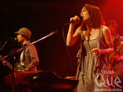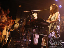 1曲目は『ウォークメン』。少しはにかんだ笑顔で登場したFREENOTEは、初夏にふさわしい、ポップでありながらも力強い空間を描き出していく。“ミュージックデイということで、最後の一音まで味わいつくしていってね!”というMCを皮切りに、『サンキューフォーザミュージック』を幸福感たっぷりに届ける。ロックが悲しみや怒りを共有するためのものなら、ポップスは幸せを存分に分かち合うもの。この日の2人は、誰もをそういう気持ちにさせるような暖かいステージを生みだしていた。続いて大きな歓声に包まれ岩瀬敬吾が登場。胸の奥が揺れるような大胆な音に、少し甘めの色気を含んだ声がよく似合う。曲間ごとにとびかう歓声に“ちゃかすなよ! 今日はクールに行こうと思ったのに…”とこぼしていたけど、言葉とは裏腹に笑顔を浮かべながら最後まで情感たっぷりに歌いあげていた。全く雰囲気の違うアーティスト同士の対バン。客層が二分化していたからこそ、観客はお互いに新しいジャンルの音楽に触れられる。ミュージックデイにこの対バンを持ってくるなんて粋ですね、CLUB Que!"MUSIC DAY 2010 in SHIMOKITAZAWA" 岩瀬敬吾/FREENOTE
