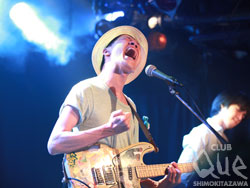 「伊豆から来ました、乍東十四雄です。乍東十四雄は友達のお父さんの名前です。」とぼけたバンド名の由来と彼らのダラっとしたけだるさを感じさせる音楽を聴いて、「ああ、夏だなあ~」と感じた。独特のボーカルと印象的なギターフレーズで妖しさをちりばめつつも、どこか愛嬌があって楽しい!高速ダンスチューンからミドルテンポのラップ調、ピアニカで楽しげに始まったと思ったら急にダークな轟音ノイズ。次々色んな顔を見せつつも面白い曲たちについつい笑顔になる。乍東十四雄の不思議ワールドにすっかりはまってしまった。お次は「歌う44歳」トモフスキー。MCでの発言。「つかれた。(持ち時間が)長い。最近髪の毛ヤバイ。(ハルさん(一卵性双生児)はタバコやめたから大丈夫の模様。)来年はもう同じルックスでみなさんと会うことはないでしょうサード・クラスの方々に向かって「髪フサフサでいいなー。ハゲろー!!」と絶叫(笑)ああ、なんて自由奔放。楽しげに呪いをかける歌なんて歌うんだよ(笑)かわいい曲調なのに呪いかけてるなんて・・・爆笑しつつもトモさんの歌にはいつもグッときてしまう。おぼろげに感じてるもやもやとかをズバッと言い当てられた気がしてハッとするのだ。ネガティブを楽しくうたう44歳は今夜も会場を笑顔で満杯にしてくれた。"【夏ノ陣 "VS series"】" TOMOVSKY vs 乍東十四雄