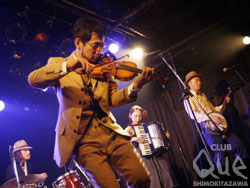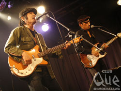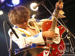 今夜はこんなの有り?と思わせるユーモア溢れるバンドばかりだ。ハッチハッチェルバンドが始まるとそこは賑やかなパリの街角。カントリー調の曲を歌劇の様に歌いあげ、シャンソンみたいな「パン屋の歌」はミュージカルのoneシーン。「今年43歳。調子外れの人生に祝福あれ! ここに来てる皆も調子外れでしょ。祝福あれ!」ラブソングを歌い始めると、その風景は一変し南国の海辺へと我々を誘う。そんな展開に驚かされながら「人生は綱渡りの歌」では旅(人生)は終わりまで楽しまなければと思わされた。パンダの着ぐるみで登場したギターパンダは「出身は岡山。好きなものロックンロール。一人でロックをやるのさ…」と自己紹介の歌から始まり、途中お客さんが「ロックンロール」と連呼し盛り上がる。被りものをとり「仲良くなれない…のは何故なんだろう」と歌ったかと思えば、エルビスならぬカルビスプレースリーで「サイテー」を。エロい歌詞にもかかわらず女子に大ウケ。そしてラストは「サイコー」な曲で締めくくった。MAMORU&THE DAViES「踊るダンスブギウギ」「ヒットパレード」とゴキゲンなダンスナンバーに皆踊るおどる!会場も揺れる!次にシャウトで始まったのはスピード感溢れるロックンロール。お洒落な下北沢系ロックンローラーだ。「キャー!」っと歓声が上がる中「ロックンロールなんか気持ち良くなくゃ意味ないよ」と歌えば、皆ノリノリ! ギターも前に出て客席を煽り、客席は最後まで揺さ振られ続けていた。次々と意表をつくバンドに心底楽しめた一夜であった。"【夏ノ陣 ”3BANDS series”】" MAMORU&THE DAViES/ギターパンダ/ハッチハッチェルバンド