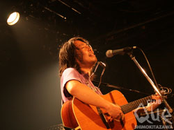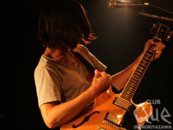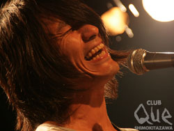 VIVA YOUNG初日はバンドではなく、ソロ対決の日。先攻はMO'SOME TONEBENDERのボーカル兼ギターの百々和宏。「FLOWER」から始まり、ループさせた音に歪んだギターをかき鳴らしアクションを決めると、かすかに残るギターの余韻をバックに次の「奇跡の歌」につながる。「俺の1番好きな曲」と言って、ジョニーサンダースの「Sad Vacation」を、「ルースターズっていうかっこいいバンドがいて」と披露したのが「恋をしようよ」。一人だと寂しいから手拍子を途中で求めたが、スピードが速すぎて皆ついていけず、ばらばらの状況に苦笑いで「下手くそー!」と叫ぶ百々さん。聴かせるだけの曲だけでなく、歪んだギターで魅せる二面性もあり十分堪能できた。続いて曽我部恵一。できたばかりのアルバムからの新曲を披露し、先取りのレコ発気分。アルペジオやコードストロークにのった優しい歌声に心が惹かれていく。柔らかいメロディが一人一人を包み込むかのような雰囲気に、アコースティックならではの良さが伝わる。さすがに曽我部さんという感触。最後は2人で互いに1曲ずつお題を選んで一緒に演奏するという、豪華なステージに。ニールヤングとヴェルヴェット・アンダーグラウンドの曲を前半後半とで交互に唄い、アコギとエレキが見事に溶け合い、すばらしい弾き語りで最後を締めくくった。"夏のVIVA YOUNG! ~ガチで行こうぜ!~ そろそろ、ソロで候" 曽我部恵一/百々和宏(MO'SOME TONEBENDER)