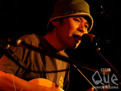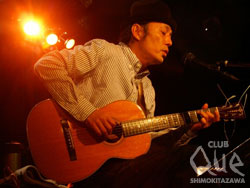 会場が明るくなると滝本が雨の中駆けつけてくれたファンに感謝しつつアコースティックで「白い霧白い月」を歌う。次はささやくよう歌えば、雲の流れる中二人寄り添う姿が目に浮かぶ。穏やかで心に響く歌が多く「濡れた傘」に至っては究極のラブソングである。途中から知久寿焼(ちくとしあき)も加わり「同じ場所で毎日同じ事をしよう…」と伸びのいい高音のハモりが心地良い。ウクレレで「僕が君の一番柔らかいところ…」と歌う歌の間奏では口笛が胸のトキメキを表しているように感じさせる。次のステージでは知久が歌い始めると会場の色が一変し詩の世界が広がる。途中で語りがある「らんちゅう」「頭の膨れた子供たち」と続き、ここで滝本を呼びいろいろな楽器で楽しませてくれる。ウクレレでの『「…いたわさ いたわさ痛い いたわさってね♪ 」おしまい』は聞き入っていた皆を笑顔にさせた。「いちょうの樹の下で」~「月が見てたよ」まで目を閉じて聞いていても心さえ瞬きできない!アンコールでは知久と滝本が一曲づつ歌い終わりとなった。歳を重ねなお純粋さ忘れていない素敵な彼らに世代を超えた熱狂的なファンが多いのもうなづける。消え入りそうに歌う滝本に客が追いかけていくシーンがあったり、知久も独特の世界観をかもし出していたが二人共通するのは素直な歌が感動呼ぶという事であろう。"「滝本晃司と知久寿焼」" 滝本晃司/知久寿焼