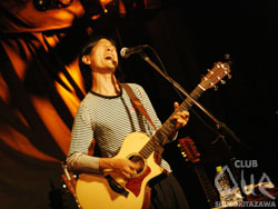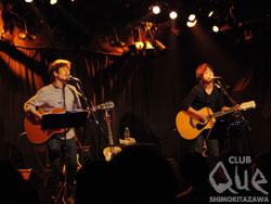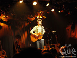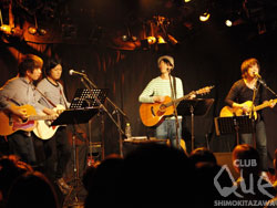 「The Ideal Acoustic Holiday」とのタイトルで、3組の弾き語りアーティストが出演。開演前のステージには、照明の淡い光に照らされた出演者のギターがずらっと並んでいて、それだけでもすごく絵になり、見てても飽きないのだから不思議だ。誰がどのギターをと想像しながらスタートまでの時間を楽しんでいた。初めに登場したのが山田稔明。ボーダーシャツがすごく似合っていて、どことなくお茶目な感じ。歌声がなんとも言えない綺麗な響きで心に染み渡り癒されていく。そして次の岩瀬敬吾は、独特な声の持ち主で力強い歌声で魅了する。次第に引き込まれるていく中で、時折見せる彼の笑顔が気持ちいい。そのそのバランスが絶妙だ。最後には裸眼。ザ・カスタネッツの牧野元とハックルベリーフィンのサクマツトムの二人が綺麗なハーモニーで歌い、2本のアコギもうまく混ざり合って、それが聴き心地よくたまらない。二人の仲の良さからの面白さも加わってくる。そして、最後には全員でのセッションで、ビートルズとブルーハーツの曲を披露。合間のMCでもそうだが、4人のバランスがうまく取れていて、それぞれの個性がぶつかり合うことなく終始楽しめた一日であった。"The Ideal Acoustic Holiday" 山田稔明(GOMES THE HITMAN)/裸眼/岩瀬敬吾