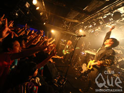 ドレスコードか!?ってくらいバンドTシャツに首タオルのオーディエンスが犇めき合うフロア。POLYSICSがオススメする次世代バンドとのガチンコ対バンイヴェント“A Touch and Go!!!”。先攻は高知の4人組バンド・宇宙人が登場。2010年のFUJI ROCK FESTIVALのROOKIE A GOGOに出演を果たした強者でもある彼ら。リズム・アンド・ブルースmeets昭和歌謡と言うべきか。淡々としているのだが、胸をざわつかせる様な不思議な空気感。千鳥足のようなリズム、舌足らずのあどけないヴォーカル、何度もリフレインするメッセージ……キュートだけど不気味。隙だらけのようで隙が無い。本物の宇宙人に会ったような感覚に陥ってしまった。SEが鳴った途端、場内は一気にヒートアップ。後攻、黒いつなぎを身にまとったPOLYSICSが登場!ハヤシの甲高い“TOISU!!”の掛け声で幕を開け、観客は前へ前へと押し寄せる。「むすんでひらいて」ではバッチリのコール&レスポンス。オーディエンスはまさにお祭り騒ぎで、メンバーの登場をお行儀良く待っていたのが嘘のよう(笑)。ハヤシとフミは激しいヘドバンをしながらギターとベースを炸裂させたり、「Mach肝心」では歌詞の中に“CLUB Que”“A Touch and Go”などを盛り込んだりと、フロアを刺激しまくる。長年のキャリアが培った安定感のあるサウンドは抜群の飛び道具だ。ハヤシは自分の頬を全力でビンタしたり、お客さんのタオルで汗を拭いたりと、ハチャメチャに見えるパフォーマンスでありながら、音に対する集中力と音の1つ1つが放つ気魄は尋常じゃない。ここまで自分たちの実現させたい世界を炸裂させ、観客に歩み寄るライヴが作れるのは本当に凄いことだ。最初から最後までクライマックス。終演後もしばらくフロアは熱気に包まれた。"CLUB Que ANNIVERSARY "SEVENTEEN GRAFFITI !!" -POLYSICS presents 「A Touch and Go!!!」- POLYSICS GUEST>宇宙人