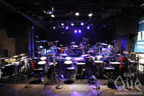 かつてドラム9台による演奏で度肝を抜いたDQS(Drums Quick Service)が、今回はドラム10台による新生DQSとして生まれ変わった。まずステージとフロアにドラムが10台並ぶ光景に圧倒される。ステージにはHAZE、ハジ、高橋、森、おかもとが並び、フロアにはハギー、北野、ケンイチロウ、比田井、小関と並ぶ。そんなドラマー10人+Gu野口、Ba平田、Key堀越がサポートで参加。リーダーのケンイチロウが中央に立ち指揮をとり演奏が始まる。一斉にドラムが打ち鳴らされ、重厚な音が体全体を包み込む。10名が二手に分かれ(さらに三分割も)、各々が違うリズムを刻み、隙間を埋めるようにリズムが合わさる瞬間はトリ肌ものだ。反復するリズムに合わせジワジワと登りつめていく様は、まるでアスリートのようであり登山家のようでもある。さらにケンイチロウは指揮もとりつつ歌もうたう。そう、DQSが素晴らしいのは歌が軸にある点だ。インスト・ジャムバンド的なノリをイメージするかもしれないが、DQSには美しいメロディがあり打楽器が歌と呼応している。MCで「歌心を持ったドラマーが集まっている」というのを、森のドラムに合わせ高橋がKANを歌いながら解説した際、場内は爆笑に包まれたが凄く解りやすかった。また、お客さんを10名ステージに上げ、音圧を体感してもらうコーナーもDQSのライブならでは。そして、2013年春頃にDQSがLookHearRecordsの第二弾としてリリースされることも発表された! 9拍子の曲に続き、本編最後はマーチのようなリズムに乗ってケンイチロウが渾身の力を込めて歌い上げた。全員が力をふり絞ってひとつの大きな作品を創るようなライブ。まだDQSを目撃したことがないなら、とにかくライブに足を運んでほしい。"新生DQSワンマン ~10 Drummers 1 soul ~ DQS[Dr1:溝渕ケンイチロウ(ザ・カスタネッツ/KGSS ON THE PEAKS) Dr2:ヤマグチユキヒコ / ハジ(ハックルベリーフィン) Dr3:高橋浩司(HARISS/The Everything Breaks)、Dr4:小関哲郎(about tess / dario) Dr5:森 信行(ex.くるり)、 Dr6:ハギー(LOVE 9 Floor/ソレカラ) Dr7:おかもとなおこ(つばき/THE GIRL)、Dr8:HAZE / ハゼ(UNUS/ex.PICK2HAND) Dr9:比田井 修(ex.School Food Punishment)、Dr10:北野愛子(your gold, my pink) Gu:野口徹平(Hi-5)、Ba:平田博信(Swinging Popsicle)、Key:堀越和子(GOMES THE HITMAN)