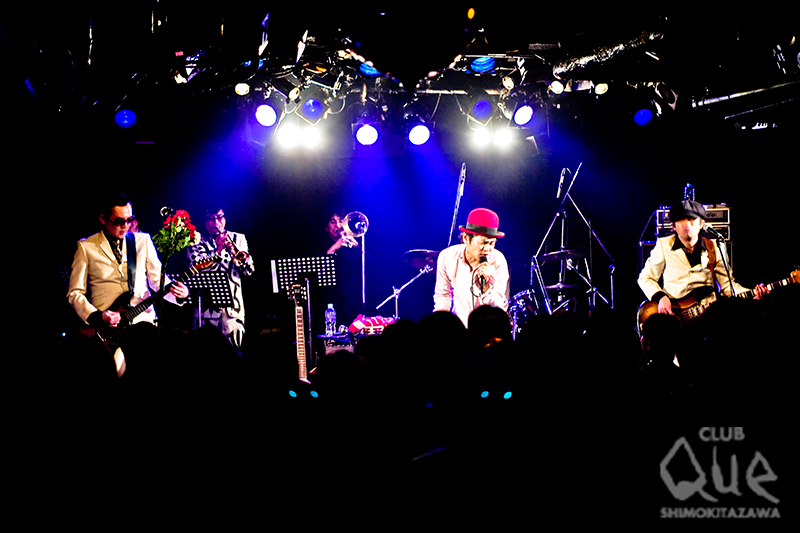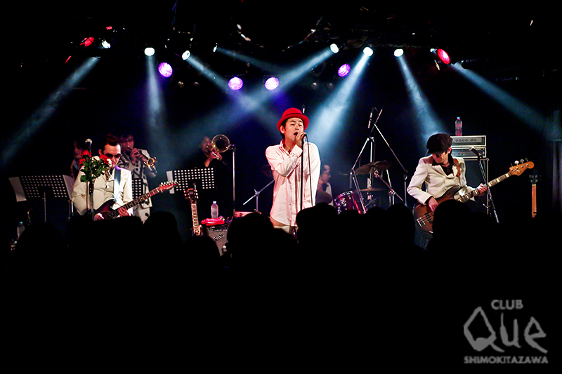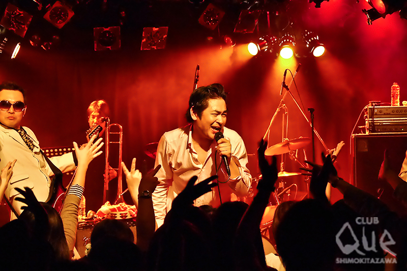 ドミンゴス20周年、CLUB Que20周年、そして数日前にボーカル吉田一休4?才の誕生日と正におめでたづくしの2DAYS、2日目は、ドミンゴスのワンマン。スペシャルゲストにホーン隊、アース・ウインド&ファイターズを向かえ華々しく開催された。開場中、昔のPVを流していた。全然変わってなくて驚き。少しだけ細身だった? 活動休止の時期もあったが20年変わらずバンドを続けている、ってのは思っている以上に大変。今年は自分たちの20周年イヤーということで、いつも以上にライブが増えるとのこと。地方での公演、貴重なセッションや、新たな音源もリリースされるとか!? 楽しみに待ちたい。肝心のスペシャルワンマンは、ドミンゴスらしく、華々しくそして楽しく幕を開けた。1st single「ウ・フ・フ」をはじめ、新旧、そしてライブの定番曲も披露。今回はホーン隊が入っているのでより、華やかだ。グッとダンサブルに聞こえる。数曲披露した後、このイヴェントのためのスペシャルユニット、井の頭ブルースマスターズとドミンが登場。それぞれドミンゴスメンバーからの派生ユニット。音楽も含め、ステージアクト、MC、全てにおいて稀にみるエンターティナーぶり。楽曲も黒人音楽がルーツにありながら、耳なじみのよい歌謡曲テイスト、盛り上がる箇所も多々あり、お客さん参加型のライブだ。ワンマンはそのバンドの真価が問われる。いくら曲がよくても、演奏がうまくても、また観たくなるようなライブをしなくては次がない。ライブはその時、その瞬間のみに生きている。ドミンゴスのライブは直接人間の欲求に答えてくれるんです。もちろん最後はゴム手袋割りを行って本編終了。ただこれで終わらない彼らのライブはアンコール計3回! 大満足の一日は、これから始まる彼らのめでたい一年のほんの序章にしかすぎない。これから繰り広げられる彼らの活動から目を離さないでほしい。