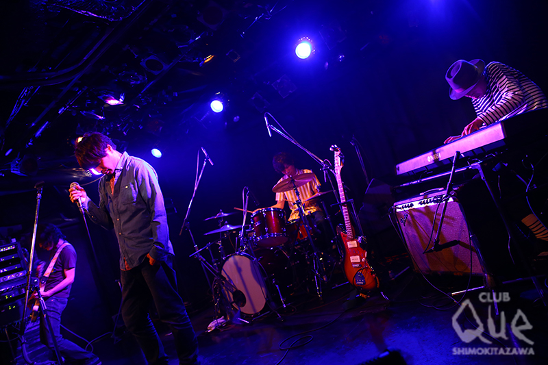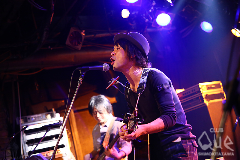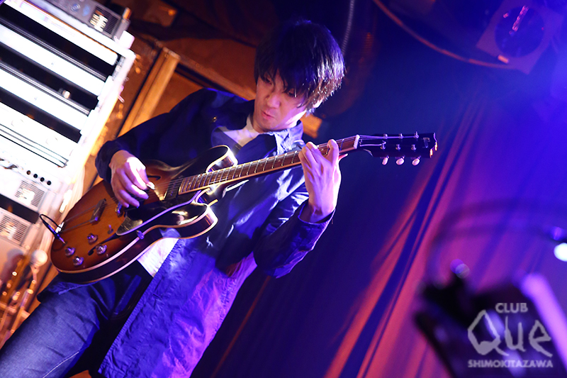 手練れシンガーソングライターによる百花繚乱の三つ巴戦、“ソラタカク”。トップバッターは元・THE CHEWINGGUM WEEKENDの橋本孝志。「ホール」「ベイビーバード」の2曲を上田禎(Pf.)のピアノを基調にしっとり歌い上げた後は、脇山広介(Dr.)、田中俊尚(Ba.)、スズキヨウスケ(Gu.)を加えたカルテット。一転して飛行機が滑走路から飛び立つ瞬間のようなエネルギーと躍動感あふれるバンドアンサンブルが放たれる。モニターに足をかけ、ハンドマイクでシャウトする姿は、13年のブランクを全く感じさせない。秋から新バンドを始動することも発表し、今後の展開に注目が集まりそうだ。そんな橋本と旧知の仲である高橋徹也が、Gibson ES-330 VOSを引っ提げて登場。「無口なピアノ」「ハロウィンベイビー」を弾き語り、橋本との思い出話をした後にプレイしたのは、THE CHEWINGGUM WEEKENDの「アイス」。シンコペーションを効かせたウェットでエロティックなサプライズ・カヴァーに会場中が酔いしれる。鹿島達也(Ba.)、ダブルヘッダー脇山(Dr.)を呼び込み、バンドスタイルにシフトチェンジ。憂いたっぷりの「ユニバース」、バックビートとボサノバギターが濃密に絡み合う「バタフライナイト」、そして闇を切り裂くヘッドライトのような16ビートが疾走する「真っ赤な車」で情熱的に締めくくった。トリを飾る裸眼は、ザ・カスタネッツ牧野元のソロプロジェクト。1曲目は「ニア」。アコースティックギターのストロークが弾け、そのまま「猫を待つ」へ流れ込み、フロアに優しい風が吹く。草加発の3ピースバンド、ハックルベリーフィンを迎え、ドラムのカウントから「1と1」へ。シャッフルのリズムとカズーのおもちゃみたいな音色が響き、牧野と佐久間のツインギター&コーラスも息ぴったり。合間に繰り広げられるMCも、楽曲に負けず劣らず楽しくて、自然と頬が緩んでしまう。地べたを這うようなベースラインがループするダブナンバー「Laugh」、無邪気さ全開の「GIANT STEP」、代表曲「裸眼」で本編は終了。鳴り止まない手拍子に応えて披露したのは、ザ・カスタネッツの「時間」。時には過去を振り返りながら流れていくとゆう普遍的な歌詞がイベントともリンクする、素晴らしいアンコールとなった。
