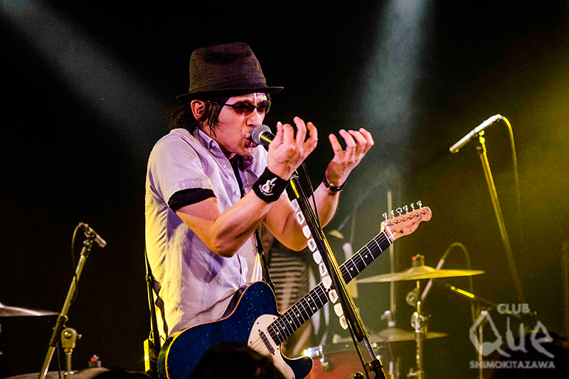 5月に7thソロ・アルバム『7↓8↑』をリリースした杉本恭一のレコ発ツアーのファイナル。拍手と歓声のなかバンドメンバーとともに登場し、「天国ロックショー」から口火を切るとキャッチーかつパンキッシュなロックサウンドとハスキーヴォイスを響かせていく。早速のMCでは、地元の同級生から久しぶりに電話がかかってきたとその会話を再現し、「土足で上がったその靴をまず脱げ!」を披露。ユーモアのある笑いでオーディエンスを沸かしつつヘヴィなナンバーをガツンとキメて、客席との距離をグッとグッと縮めていった。杉本の奏でるアコギを軸にしっとりと歌われる「Composition」は、“歌うこと”へのメッセージが込められた渾身のバラッドだ。じっくりと堪能させてくれた後は、自宅近くでよく見かけるという驚異の“ド不良ババア”の言動を熱烈に語り、どかっと笑わせる。続いて演奏された「Tomorrow never knows」と「オー・ソレ・ミオ」は、(ドラムの)スネアを前に移動し楽器隊と杉本の4人が横一列に並ぶ編成。それにより音はさらにパワフルに刻まれ、3人のコーラスが重なり豪快な演奏で観客を圧倒した。本編ラストは「Making Point」、冒頭のスレッスレで絡み合うユニゾンと軽快な4つ打ちダンス・ロックチューンに拳が上がり激しいステージで幕を下ろした。アンコールではピアノの同期と奏でる「キャロラインベッキー」など4曲を披露。名義はソロであるものの、限りなく1組のバンドを見ているような立体的なサウンドと一体感はさすが。新作の収録曲をたっぷり聞かせつつ、王道ロックチューンからアングラの香りがするミドルテンポのナンバーもバランスよく盛り込まれたメリハリのあるライヴだった。50歳を迎えたなんてその佇まいからは信じられないが、ますます高みを目指していく彼のサウンドに魅了された一夜だった。 [文/大島あゆみ 撮影/藤本美紀子]