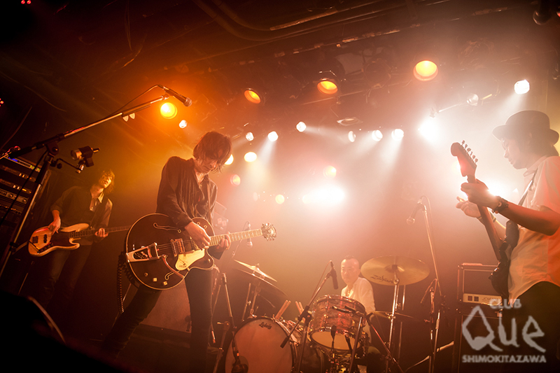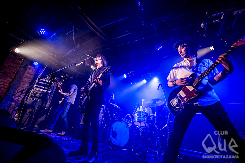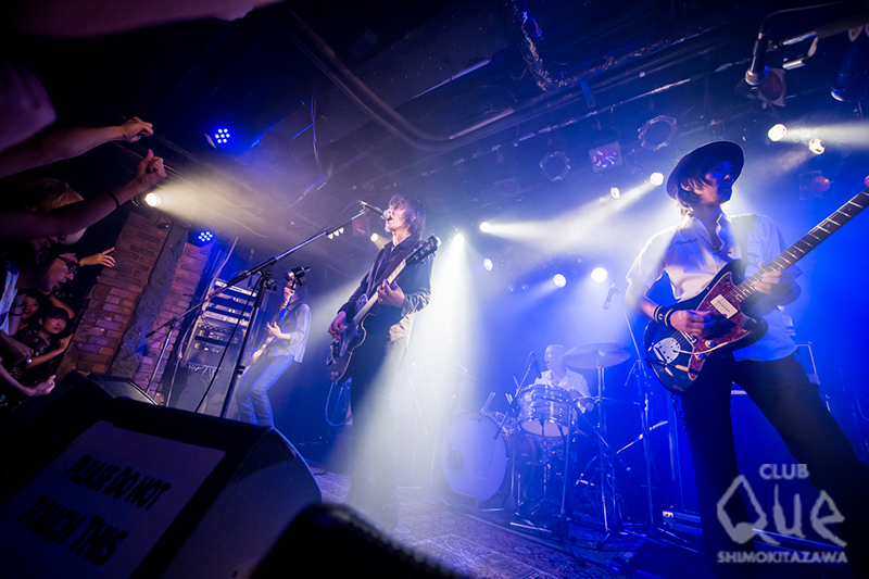 今年5月28日にリリースした7thアルバム『COME TOGETHER』を引っ提げて、The BirthdayがCLUB Queに初登場。フェスのヘッドライナー級のアクトがキャパ280の至近距離で拝めるとあって、完全抽選制のチケットは言わずもがなソールドウト。開場するやいなや特設の柵が設けられたフロアが人で埋まってゆく。絨毯の上に並んだエフェクターの点滅するランプがワクワクを加速させる中、BGMが途切れると同時に暗転。The Crests「sixteen candles」が流れ、クハラカズユキ(Dr.)、フジイケンジ(Gu.)、ヒライハルキ(Ba.)、チバユウスケ(Vo.Gu.)が登場し、割れんばかりの歓声が起こる。音を鳴らす前から圧倒的なオーラ。「LOVE GOD HAND」の硬質なビートとデス声コーラスをど頭から叩き付け、「SAKURA」「アイノメイロアイノネイロ」と新譜からの楽曲を中心に、五感を震わす爆音ロックサウンドを放射してゆく。一転して「STAR MAN」「KNIFE」「LEMON」と情緒たっぷりなスローナンバーを3曲続けて披露し、下北沢の変貌ぶりに驚いたと短くMC。「JOIN」のジャキジャキと刻まれる裏打ちギターとシンガロング、「情熱のブルーズ」の疾走するグルーヴと猛り狂う獣のようなヴォーカルが、ボルテージをぶち上げ、「なぜか今日は」の眩いメロディーとエイトビートがオーディエンスの胸を締めつける。「星に願いを」「COME TOGETHER」「くそったれの世界」と畳みかけ、アンコールへ。「涙がこぼれそう」の冒頭“俺さ、今どこ?”の歌詞に続き、「今日は本当にどこにいるのか分かんなくなったよ。てんやがあった所にてんやがないし。今は、ファッキン下北沢!!」とチバが変わりゆく街への想いをシャウトし、壮絶な盛り上がり。鳴りやまない拍手に応え、クハラがステージへ再登場。ダンサブルなドラムソロをおっぱじめ、メンバーが順繰りに加わり、ラストチューン「ローリン」へ流れ込む。ハネまくるリズムに、ハンドマイクで歌い踊るチバのブルースハープが吹き荒れ、コール&レスポンスがこだまする、最高にゴキゲンなダブルアンコール。CLUB Que、The Birthday、双方の歴史に残る夜となった。