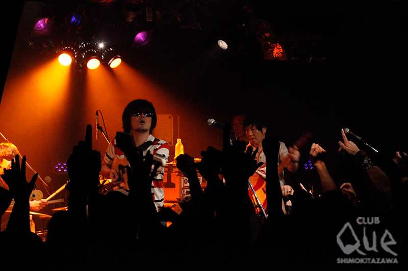 CLUB Que20周年ということでキャパシティオーバーのバンドにも関わらず、気持ちよく2デイズを引き受けてくれた。だけどやっぱり一筋縄ではいきません。まずのお題は、俺にホールの真ん中にテニスの審判みたいに高椅子に座ってろと。「さわおくんが言うなら何でもやるよ」といったものの、さすがに隅っこで超満員のお客さんに迷惑かけない程度にDJブース組んでそこに居ることにしたんだけど、くわえてDJっていうか店長がですよ、ステージからのバンドのMCに受け答えをするという前代未聞のシチュエーション。そして第2はDrのしんちゃんが8月のTheピーズの対バンで一緒になったダイナマイト☆ナオキを前座に迎えるという想定外の2つの出来事に、裏方サイドはライブ前からただならぬドヨメキがあったのです。初日は聴き味のよいセレクトのDJからナオキへ。これが想像以上にいいオープニングアクトでQueを暖めてくれた。2日目はより爆笑を誘う。そして両日とも「次はthe pillows!」のコールと共に満員だったホールの後ろに少し余裕ができるほど詰め寄るオーディエンス! 熱いね! この日ばかりはエアコン新調して快適なはずのQueが、開店当時の換気が悪かった20年前を思い起こすかのような空気。加えて滅多に聴けない初期の曲を披露すれば、当然無限にヒートアップして「ロックのライブ=ちょっと苦しい」を体現する。これはpillowsの25周年とQueの20周年がコラボして生まれた特別な時間だった。不思議なのは懐かしい感じではなくて今を攻めてる鮮烈なライブ感。歴史のある曲たちもイキイキしててエネルギッシュで昔を思い出す暇もない。思い出すのはMCの合間にさわおくんが振ってくる「Queとpillowsってどんなことがあったっけ?」と聞かれるときだけ20年間の色んな事を思い出してるんだけど、まあ上手く喋れなくて5%くらいしか言えなかった。一緒に映画を作ったり、ほんとに色んな事があったんだけど、純粋にライブを突き詰めてきたバンドだから、20年前も今も思い出す色は変らない。一貫してロックでバンドマン。そして先輩も後輩もバンドが良ければ親身に応援する姿勢。これがありそうでない独特のシーンを生んでるし、カッコいいpillowsをよりカッコよく見せちゃう。誰かにバンドってどう有るべきって聞かれたら真っ先にpillowsの名前をだすよね。2日目は鳴り止まない歓声に予定外のダブルアンコール。カッコよかった。心底感動したし、楽しかったよ。それ以外表現する言葉が見当たらない。それでもって打ち上げは6:00amですから。タフなお方たちですわ。ほんとに。