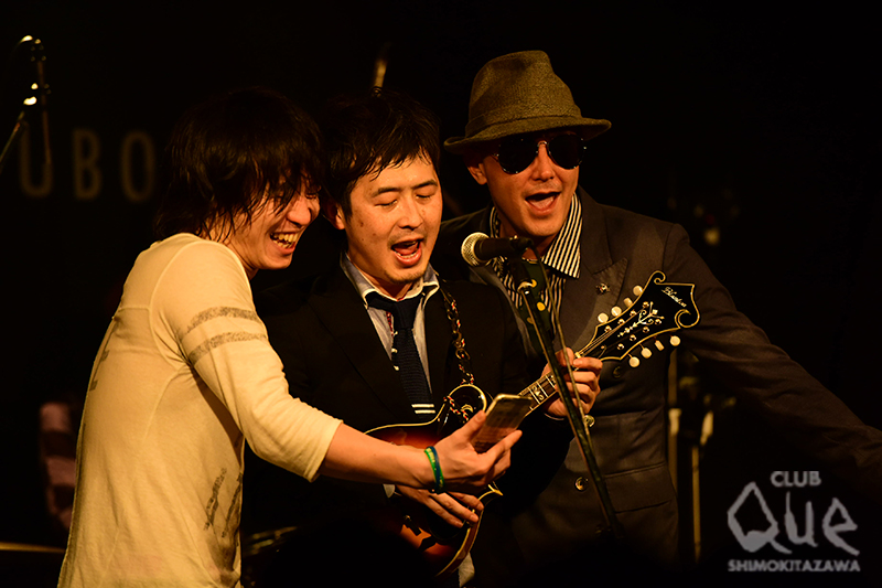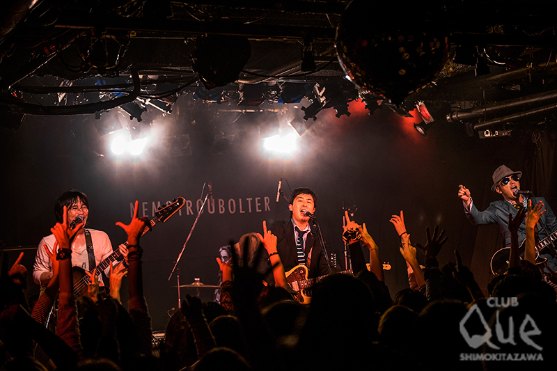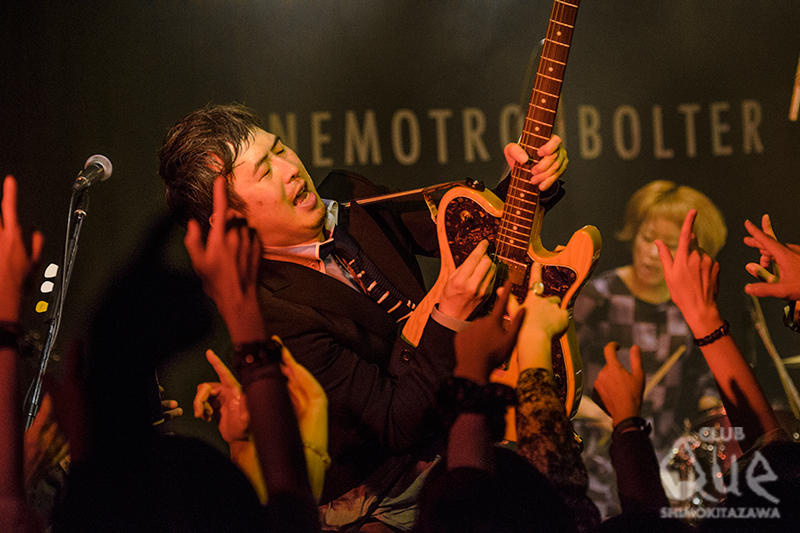 12月7日「ネモトラボルタ~合法ワンマン~」と称し、そしてCLUB Queでの初ワンマンが行われた。開場の時点から列をなしていて、開演15分前にはフロアには観客で一杯になっていた。SEが止み、ジャーンとネモ(Vo.GU.)のギターから始まり、「ENTAI」「HELLO」「スキッパブルース」と最初からガッツリしたギターロックに観客も応え、開場全体が波のように揺れる。「No Release, No News。只々ワンマンを行っちゃいました!!」とドッと観客を笑わせ距離をグッと縮めていく。「Yeah! Yeah! Yeah!」ではラップ調のボーカルにジャジーなソロ、そしてR&Bのリズムが乗った最高のグルーブを体感できた。また、メンバー紹介での各ソロパートからの「逆走ロック」の流れは圧巻で、フロアからは生えるように観客の手が伸びていた。ドラムにはdetroit7からみよちゃんこと山口美代子が参加しており、細い身体からは想像も出来ないくらい激しいドラムを叩き、小気味よくリズムを刻んでいく。「All I Need Is Love」ではハル(Ba.)の最高のベーステクをバックに、ネモとケイ(Gu.)がつば競り合うようにギターソロをお互いの息を確かめるように弾きあう。アンコールはネモがマンドリンを片手にステージに戻り、中央のマイクにネモ、ハル、ケイがマイクに集まり、「Don’t Cry Baby(仮題)」を披露した。この日は一曲目からラストまで最高のテンションの中で行われ、ステージもフロアの観客も汗まみれの笑顔。各メンバー(ネモ以外)、ほかのバンドも平行して活動している中でのライブは、演者も観客もいつでも帰ってこれる場所であり、最高の刺激でもある。今夜は「合法ワンマン」を冠している通り、純度の高い音楽によって最高にハイにしてくれた夜であった。次回のライブは3月18日(水)に決定!十分に期待して待っておこう。[文/松本泰弘 撮影/藤本美紀子]