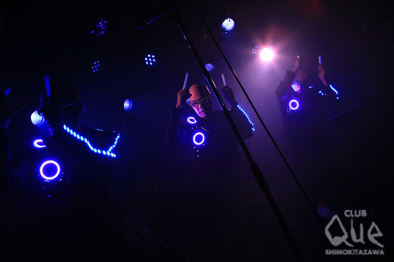 2014年もいよいよ大詰め、年の締めくくりに相応しいアーティストがQueに集結した大晦日。間もなく迎える新年まで楽しい時間を過ごそうと、第一部から多くのお客さんで賑わっていた。トップバッターは、BOZE STYLE。ピカッと光る電飾付きの衣装を身に纏うメンバーと観客が持っているペンライトでのっけから華やか、ボウズを題材にしたユーモラスな曲で笑いを誘う。「あ、ずれてる」では、ギラギラ輝くミラーボール型のヘルメットを装着!くるくると回り体をはって楽しませてくれた。