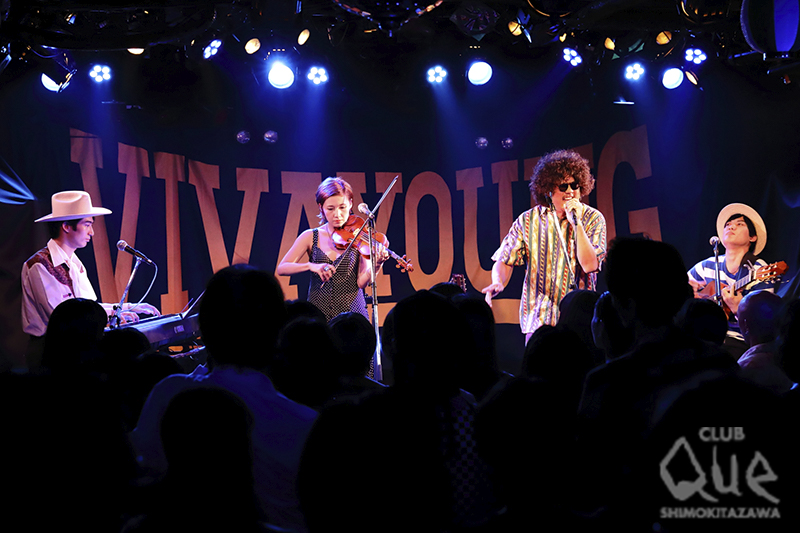 会場には提灯が飾られ連日出演者が書き残した習字や観客のメッセージが貼り出され、すっかりお祭り気分だ。DJをしながら観客を迎えるクラヤマは、“俺も朝6時から仕事してきました! みなさんも良い金曜日を過ごしてください!”と、挨拶しZAKOMBO(ONE TRACK MIND)+Reina Kitadaを呼び込んだ。まずはZAKOMBOが弾き語りでしっぽりと1曲披露すると、Reina Kitadaとバンドメンバーが登場。ZAKOMBOの味のある歌声に、ピアノ、ギター、Reinaのヴァイオリンと甘美な歌声が重なり合う「オニオンボーイ」や、Reinaがメインでしっとりと歌い上げる「ナターシャ」などを披露する。シンプルで味わいのある軽やかな音色は、ポップなのにほんのりエキゾチック。ずーっと聴いていたいと思わせる心地良さだ。最後は「オーロラ夜話」と、ロマンチックなナンバーを奏でて、ビバヤングに華を添えた。