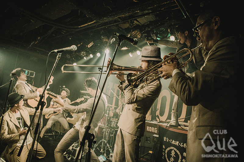 2番手は日本が誇る、大阪を拠点に活動するスカロックバンド、DOBERMAN。美しいピアノの伴奏に吉田田タカシ(Vo)が独唱する「月もかくれて」で始まった。息を飲むような雰囲気から一変、独特の和のムードを感じさせるスカ「諸行無常」で、ホーンを含む大所帯8人組のお祭り騒ぎのステージは一気に沸点へ。ベージュのスーツに身を包んだ、どこか凶暴性を感じさせる強烈な個性の伊達男たちが入り乱れるライブ。「マリー」で高らかにホーンが鳴らされ、「Bella ciao」でさらに原賢二のアコーディオンが炸裂! 魅せるプレイに客席からの拍手と歓声が飛んだ。「音楽にはパワーがある」と説く高速スカ「朱い太陽」で驚喜と狂気が交差するフロアは踊りまくり、ラストは酒飲みソング「マシジャ」で陽気に盛り上げた。