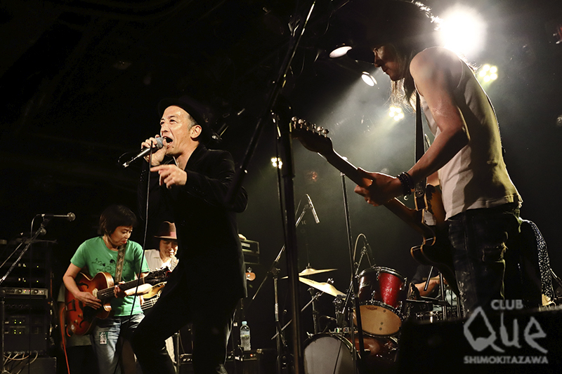 そしていよいよSUPER BADが登場。一曲目は高田エージ(Vo)、鹿島達也(Ba)、 内藤幸也(Gu)の3人での演奏。3人で体を揺らしカウントをとって始まった演奏は強烈にリズムを感じさせる演奏だった。ドラマーなしの編成なのだが3人の中には遠藤典宏が叩いている、そう感じる演奏であった。すぐに観客全員が手拍子を始めまさに会場のすべての人の中に遠藤典宏というドラマーを呼び起こした。ゲストメンバーとして長見順(Gu)やYUCALIE(Vo)を招き次々に演奏していく。オリジナルメンバーでもある関口道生のギターは想像以上のクリーンサウンドで歯切れの凄まじいカッティングと和音に高田エージのシャウトはまさに現在でも色褪せることのない楽曲とエナジーに満ち溢れていた。