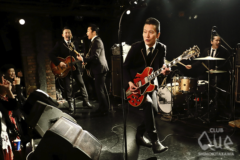 THE NEATBEATSとTOMOVSKYのツーマンというスペシャルな夜! 先攻は意外? にも、THE NEATBEATSだ 。“ニートビーツです、ようこそ! いけますかー!”とMR.PAN(Vo.Gu)煽ると「FARMER JOHN」から、ニートビーツ節全開の痛快のマージービートを奏でて、グイグイとヴォルテージをあげていく。一気に5曲を駆け抜けてMCに入ると”拍手より笑いが欲しい!”と、MR.PANの歯に衣着せぬマシンガントークでどかどか笑いをかっさらう。この日は平日にも関わらず大勢のファンが駆けつけ、賑わうフロアを前に”しかし、こんなに新鮮味のない対バンないけどね! さすがトモフや!(笑)”と、ぶっちゃけながらも久しぶりのツーマンを喜んだ。”OK! ツイストいけるかー!?”と煽り「TWISTIN' TIME WITH YOU」が鳴ると、オーディエンスはごきげんなビートに身を任せて踊りまくりだ。MR.MONDO(Vo.Dr)がメインボーカルを取る「NEW OREANS」では、コール&レスポンスを交えて盛り上げ勢いを加速させる。終盤には、ミディアム・テンポの「WEEKEND」と聴かせるナンバーも差し込みつつ、各メンバーが代わる代わるボーカルを取り冴えまくりのライヴを披露。ラストは「黒いジャンパー」を演奏し、25分オーバーの盛りだくさんのステージを締めくくった。