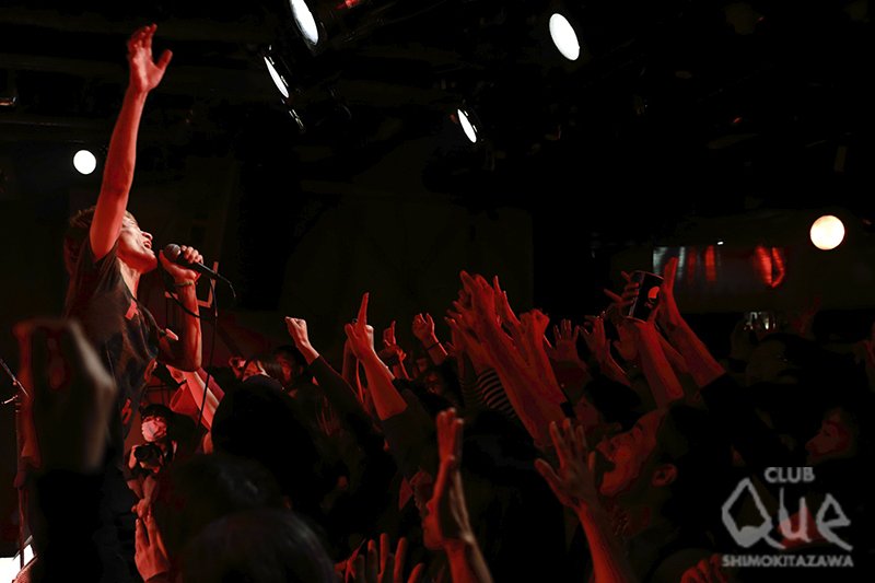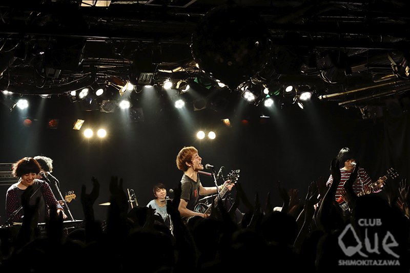 お次は、バンドTOMOVSKY。ドラムのセッティングに時間がかかっていると”じゃあちょっと弾き語りしようか”と、TOMOVSKYが提案し観客からテーマを募り、即興で歌い始める。その流れで「ニートビーツ、、25分押し~♪」を演奏すると、MR.PANが登場、なぜだかThe Beatlesの「let it be」に。その延長で「不在」から本編へなだれこむと、待っていました! と言わんばかりに観客が拳を上げて応える。爽快なロックナンバー「スピード」や、陽気な裏打ちが心地いいスカ・テイストの「巨大なダムのありんこの穴」と、キャッチーなサウンドで魅了。TOMOVSKYは、“ニートビーツみたいに、カッコよく続けて曲を演奏してみたけど、曲調が違うから全然ならないよね(笑)”と笑いかける。大木温之(Ba)とのゆるっとした兄弟トークも挟みながら、“死んだ後のこと”を描いた「作戦会議」や「映画の中」と、ポップでユーモラスなナンバーを伸びやかに歌い上げた。最後の「脳」では、観客もシンガロングして大合唱。賑やかにステージを去っていった。