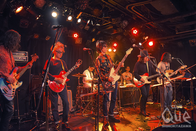 中盤では直枝政広(Vo.Gu)が登場。Big Star「Thirteen」では名プレイヤーの演奏に乗せて直枝が心地よさそうに歌い上げ、一方Crosby,Stills,Nash&Young「OHIO」ではリズム隊の奏でる雄大なビートに乗せ、各々が白熱したプレイで魅せる。続いて藤井一彦(Vo.Gu)が登場し、The Rolling Stones「Wild Horses」を披露。ゲストが全員揃ったことでプレイはさらにヒートアップし、濃密に絡み合うサウンドや強固なグルーヴを構築する。また、見事に住み分けがなされた4人のギターや、藤井と直枝のツインボーカルも圧巻だった。Jimi Hendrix「Hey Joe」の日本語カバーでは、藤井のソウルフルな歌声や背面弾きに観客の目は釘付けに。本編ラストはストーンズの「Honky Tonk Women」で幕を閉じるが…。阿部が「また出てくるので、(アンコールの)拍手はやらないで大丈夫です」と言い残し、笑いを誘った。