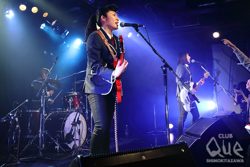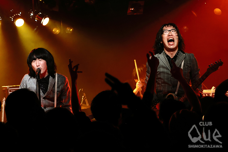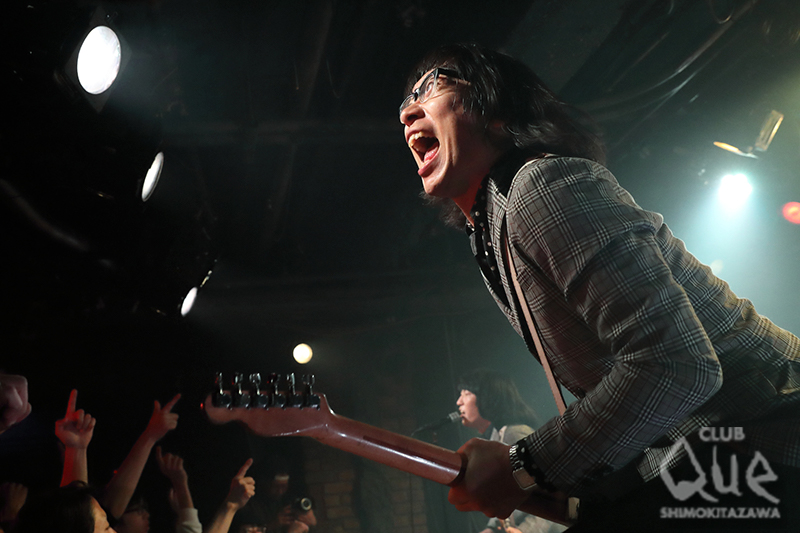 「久しぶり~! CLUB Que~! 帰ってきました!」とダニー(Vo.Gu)と超ハイテンション投げかけ「ロックンロールマジック」からザ50回転ズのステージが幕を開ける。強烈なサウンドと豪快なステージングで圧倒すると「本家の恐ろしさ、見せてやろうかな〜!」と、さっきコピーされたばかりの「レッツゴー三匹!!」へ。豪速球を投げ込んでいくようなアグレッシヴなナンバーをキメれば、観客も自ずと拳を振り上げて応える。MCではダニーが初共演のザ・ステファニーズへ「愛あるコピーバンドをありがとう!」と伝えると「でも、あのクオリティの低さ、練習不足!」とディスティニーをいじって笑いを誘いつつ「彼女たちのピュアなロックンロール! 初めて会いましたが、彼女たちの本当に真面目な姿勢におじさんはメロメロです」と3人を絶賛。中盤には「新世界ブルース」と歌謡チックな雰囲気のあるナンバーや軽やかなビートと鮮やかな照明がシンクロする「Trip! Trip!」、ノスタルジーな「涙のスターダストトレイン」と多彩な楽曲を盛り込みながら、ラストに向けて再び加速を始め「50回転ズのテーマ」、「おさらばブギウギ」と痛快なロックンロールをかき鳴らして締めくくった。